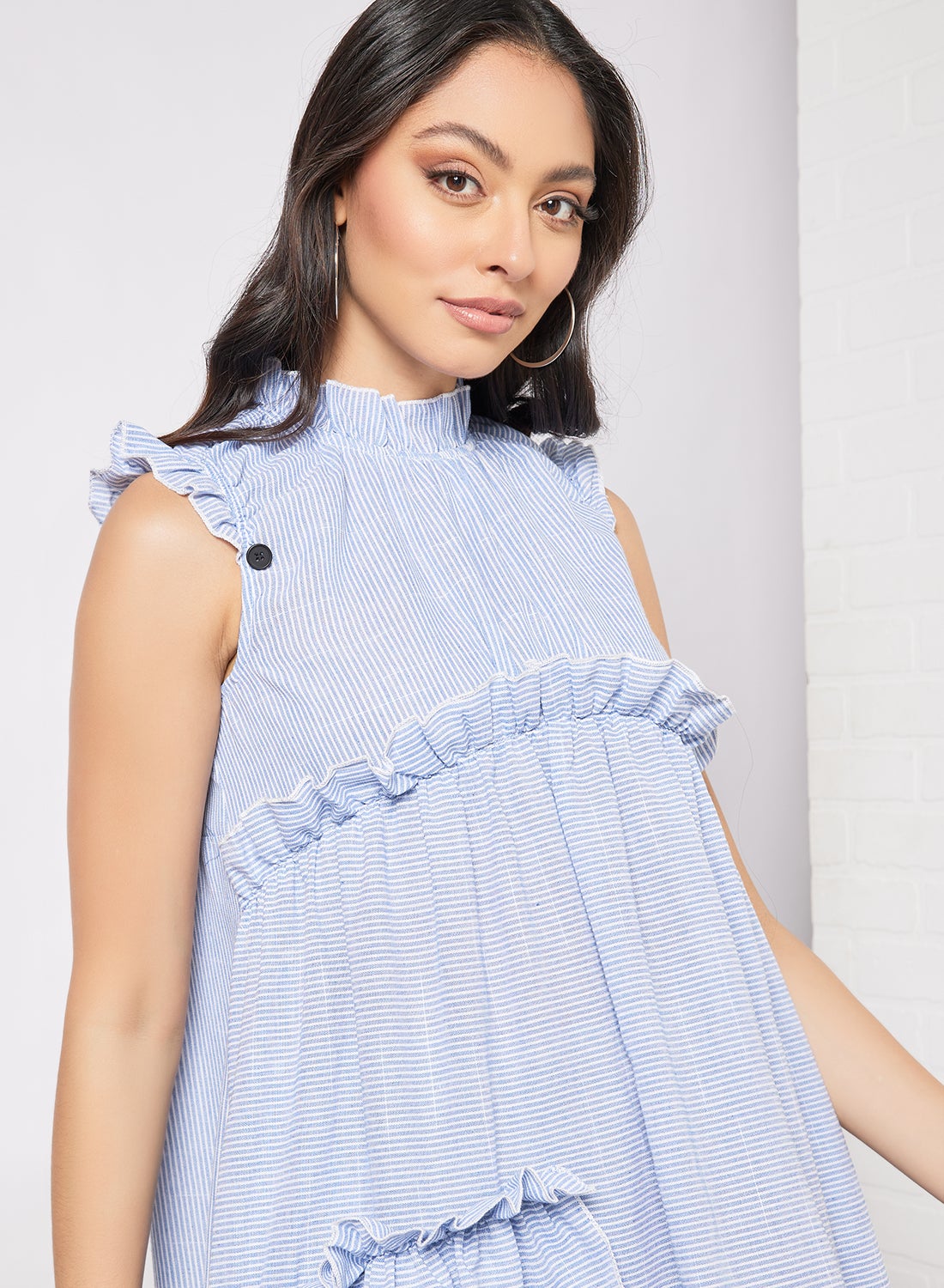 Blue Striped Sleeveless Layered Dress with Ruffle High Neck for Women.