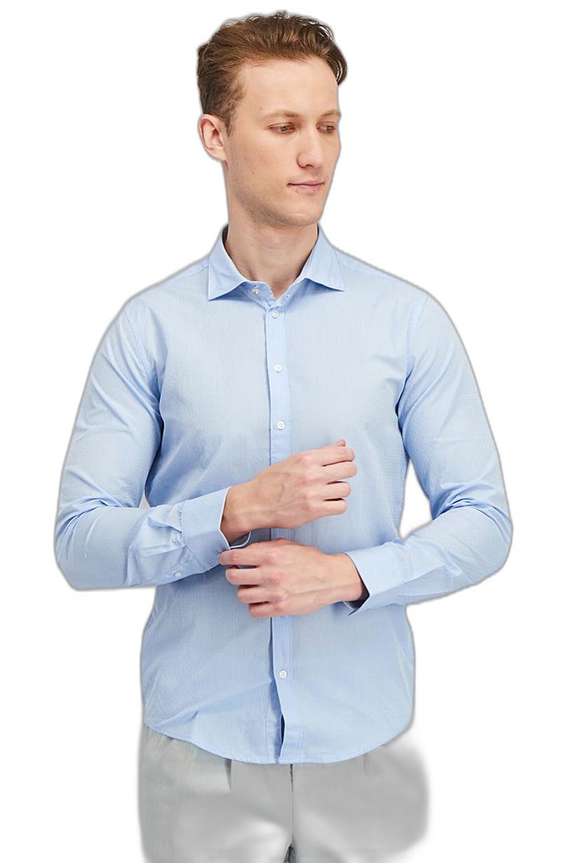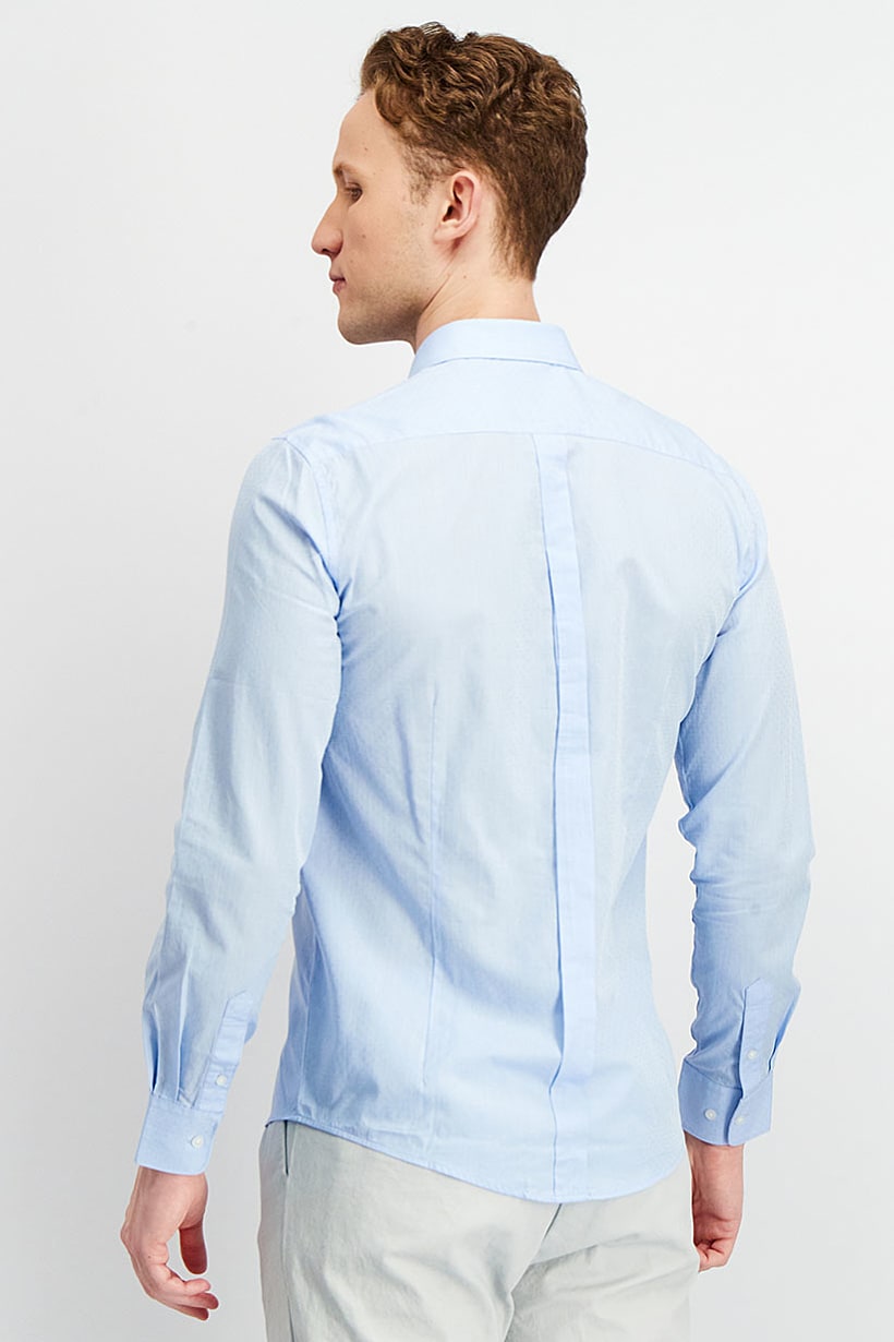 This product is made of 100% cotton and is machine washable. It has a regular fit and features a textured pattern with a spread collar and button closures. The sleeve length is long and the hem is slit. The size shown is Italian and the color family is blue. Please note that the product color may appear slightly different due to photographic lighting sources or monitor settings. This product is suitable for casual occasions.