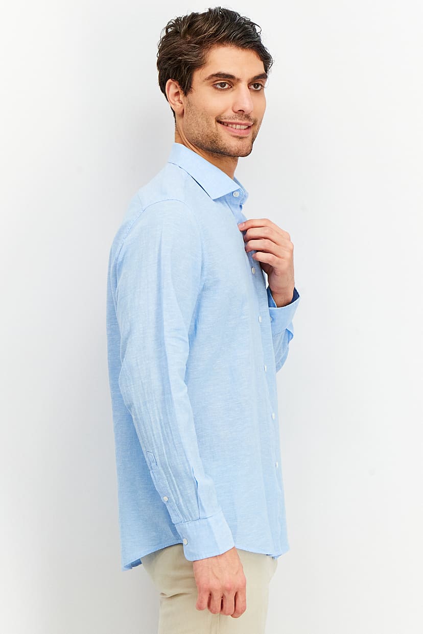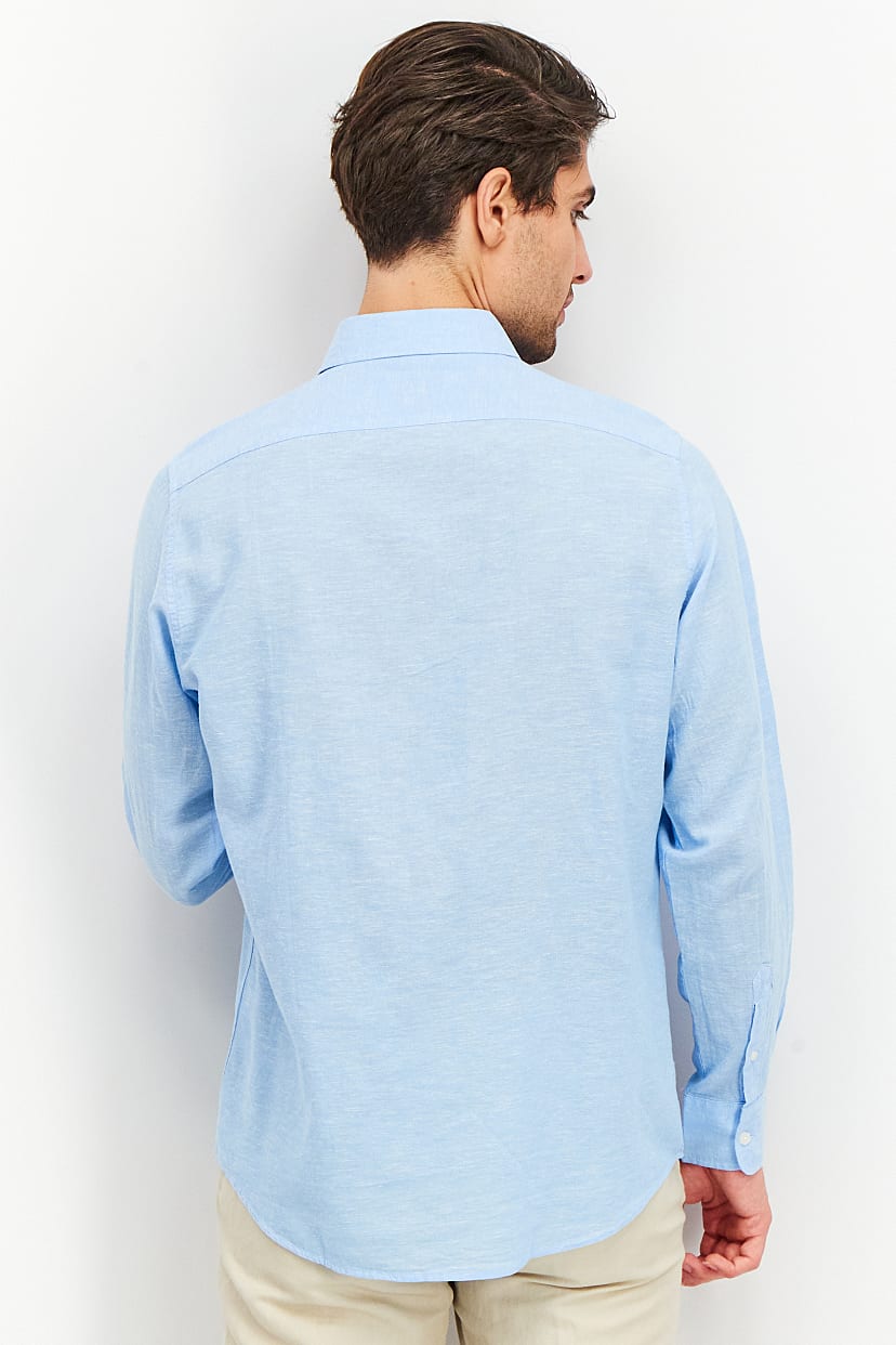 This product is designed for easy care as it is machine washable. It has a regular fit and is available in international sizes. The long sleeves have a straight hem and the spread collar adds a touch of sophistication. Please note that the product color may appear slightly different due to lighting or monitor settings. The fabric is a blend of 55% linen and 45% cotton, making it perfect for casual occasions. The textured pattern adds visual interest and the button closures complete the look. This product comes in a blue color family.
