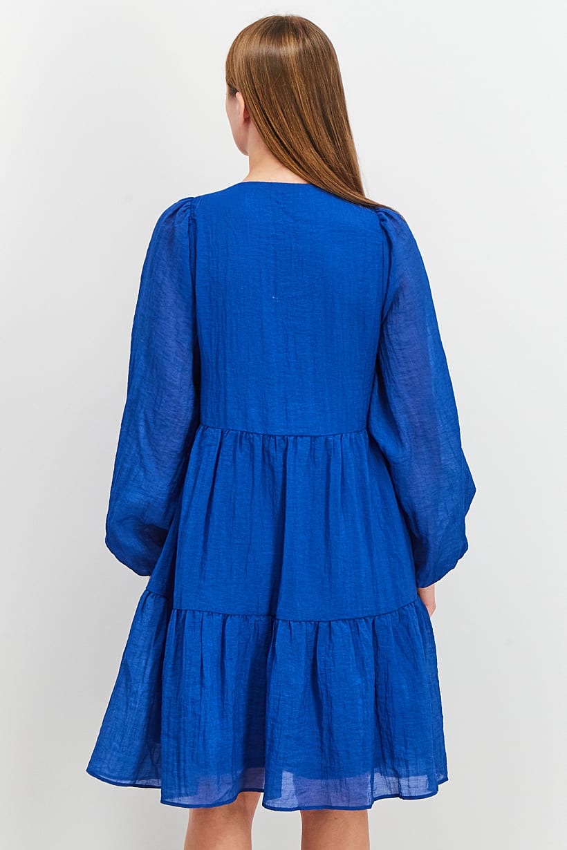 This product is easy to care for as it is machine washable. It is a mini dress with a regular fit and a straight hem. The neckline is a flattering V-neckline and it has long sleeves. Please note that the product color may vary slightly due to lighting or monitor settings. The dress is made of 51% Polyamide and 49% Viscose and has a textured pattern. It is perfect for casual occasions and has a pullover closure. The color family is blue and the size shown is EU.