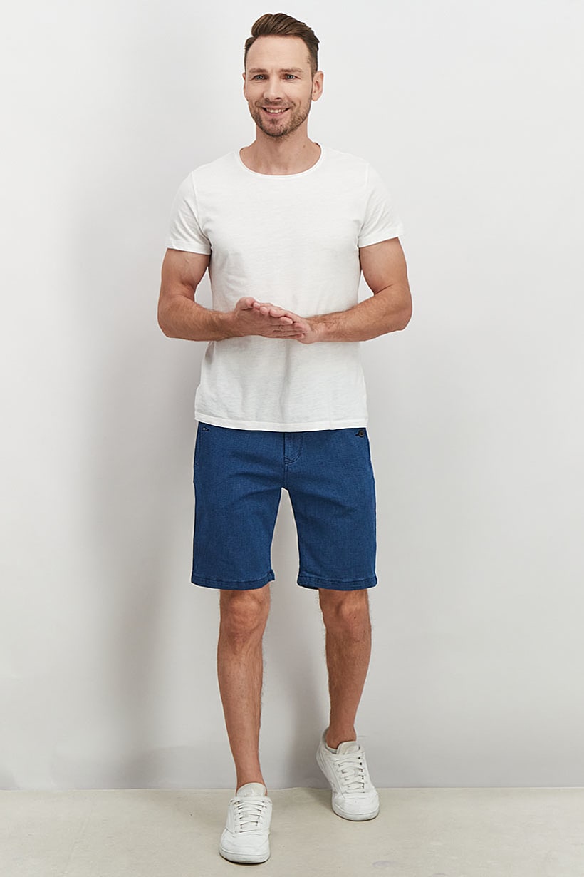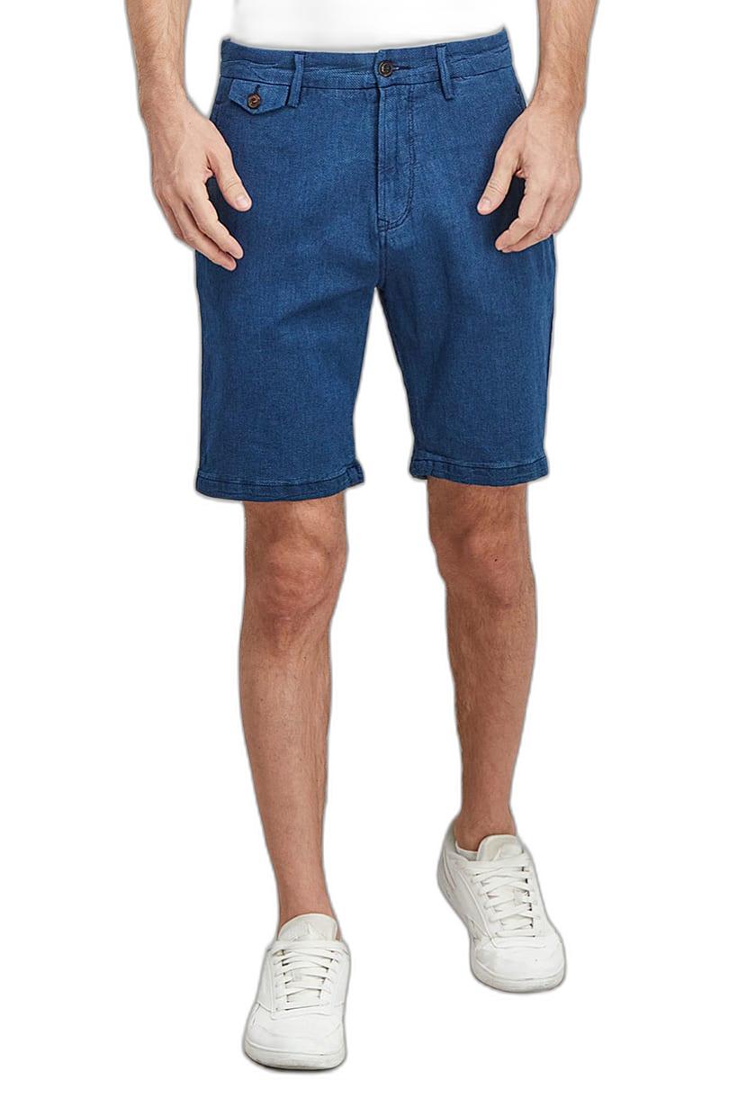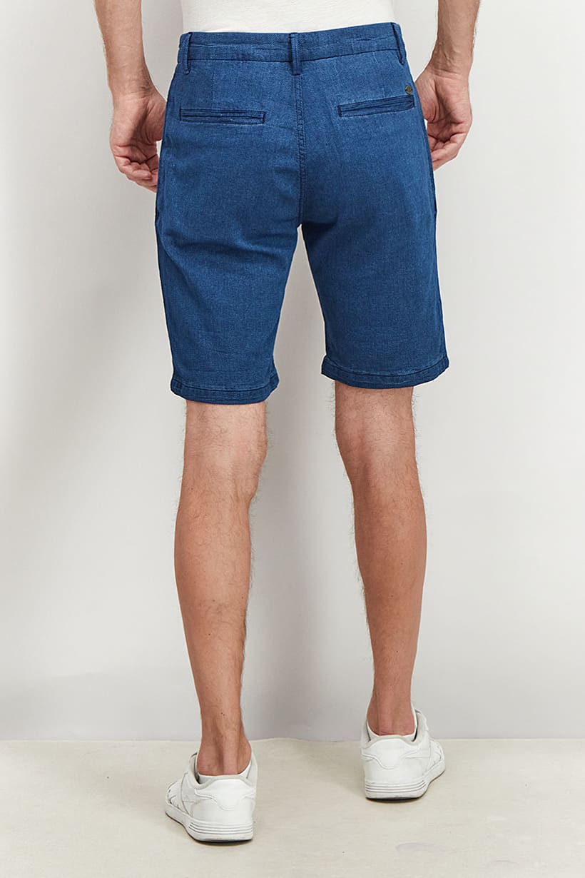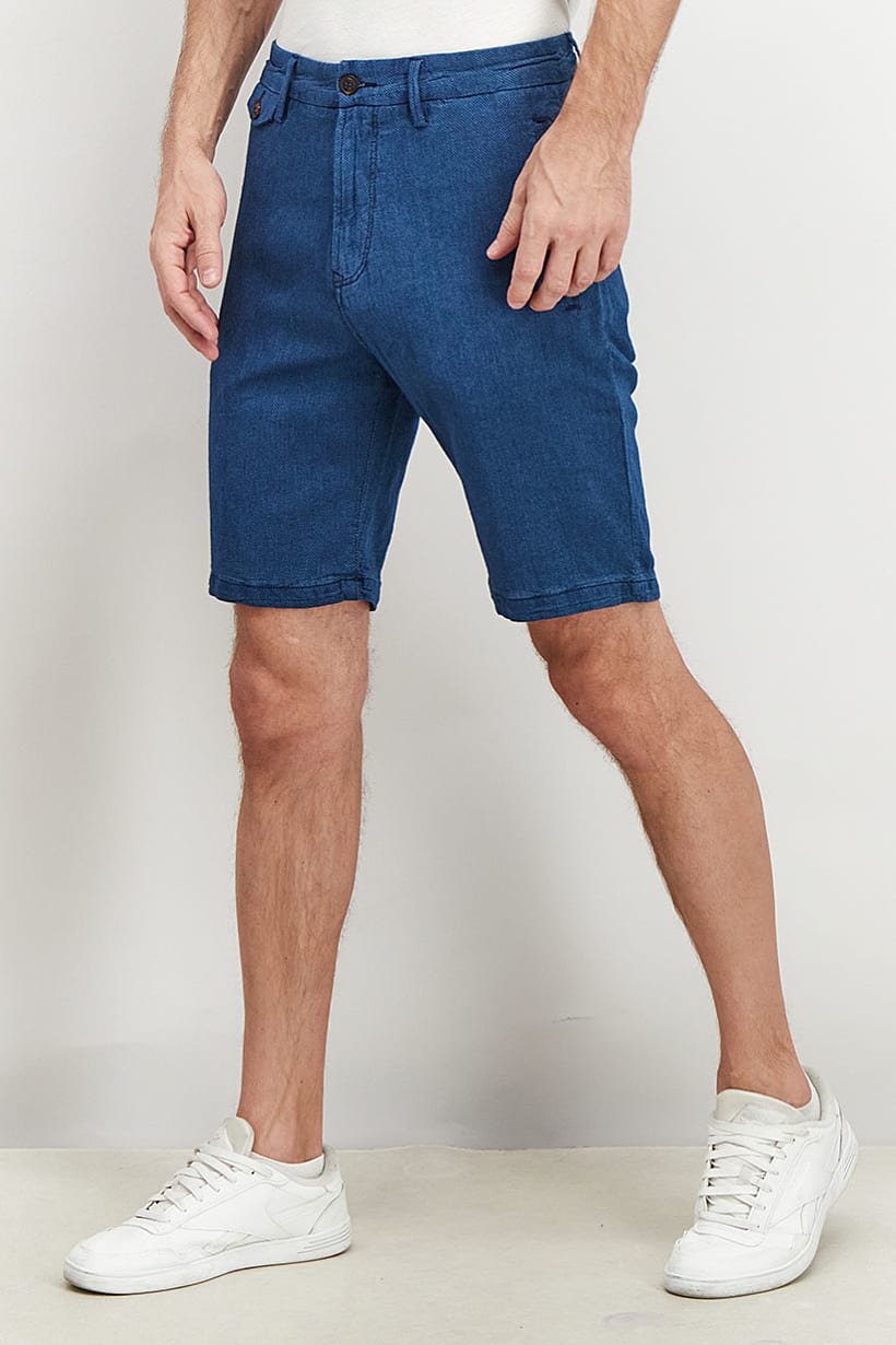 Bottom Hem : Straight, Care : Machine washable, Fit : Regular fit, No of pockets : 5, Size shown : Inches, Stretch Type : No stretch, Type of Short : Basic short, Bottom Closure : Button, Zipper fly, Disclaimer : Product color may slightly vary due to photographic lighting sources or your monitor settings., Fabrics : 100% Cotton, Occasion : Casual, Pattern & Print : Textured pattern, Color Family : Blue,