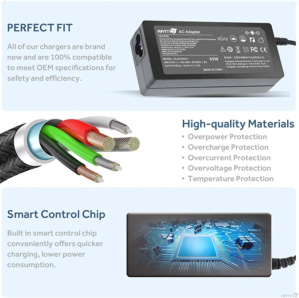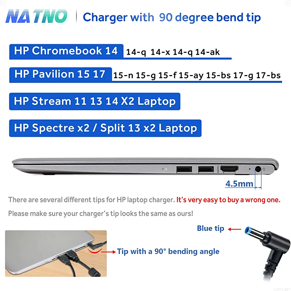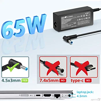 Introducing our 65W Laptop Charger, which has an input of 100~240V and 50-60Hz, and an output of 19.5V 2.33A, with a maximum power of 65W. The charger comes with a blue tip of 4.5×3.0mm and a built-in protection chip. NATNO is a professional manufacturer of laptop chargers, and this charger is designed for HP Pavilion Envy X360 laptops. It is the perfect choice for a backup or replacement charger.