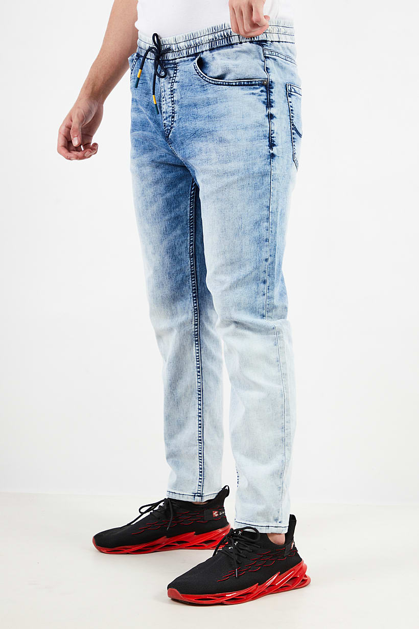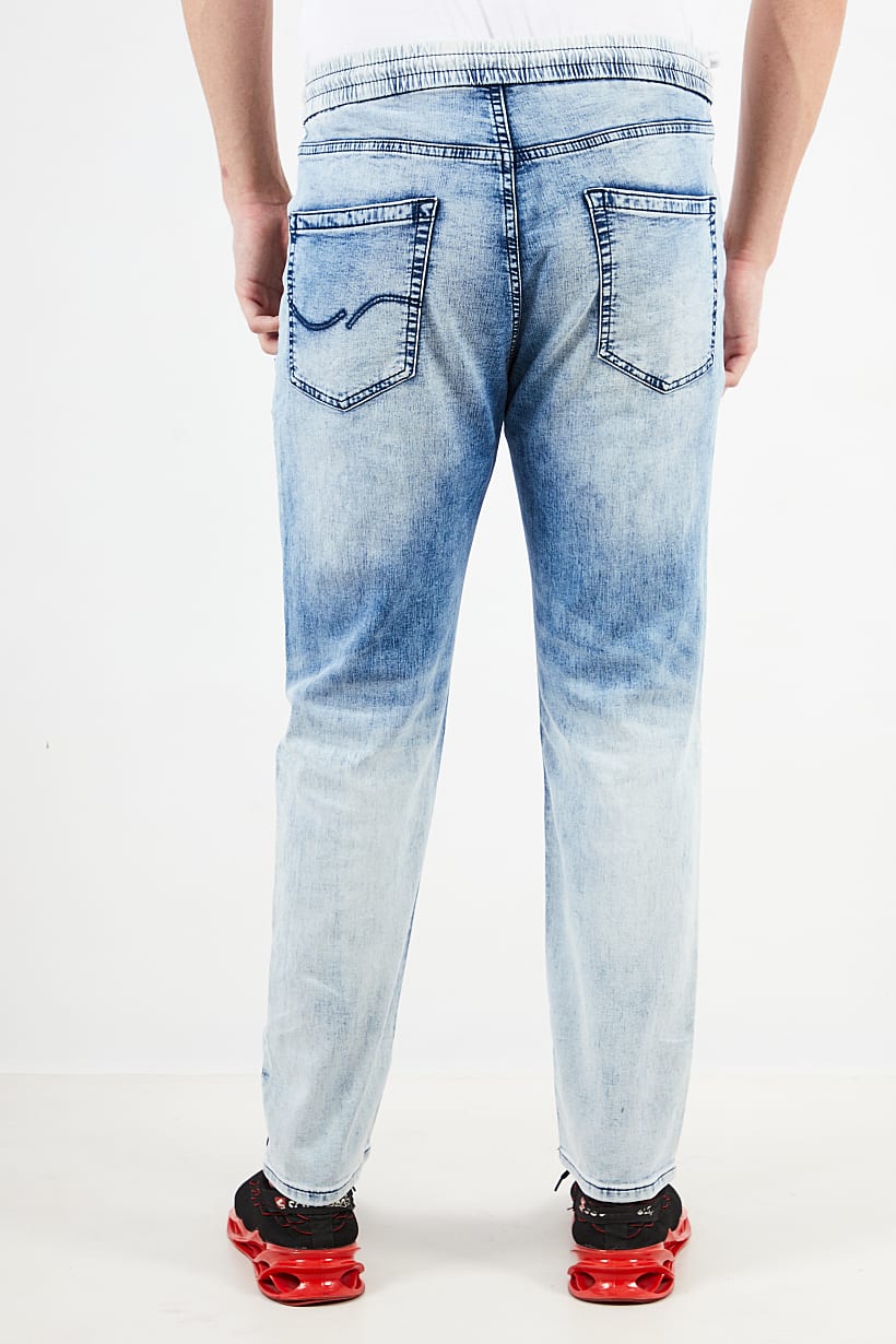 Blue Washed Drawstring Denim for Men with Tapered Fit.