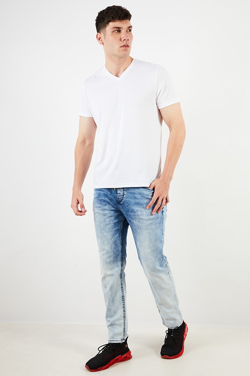 Bottom Hem : Straight, Care : Hand wash, Fit : Tapered, No of pockets : 5, Size shown : Inches, Stretch Type : Stretchable, Types of Jeans Rise : Low rise, Bottom Closure : Drawstring, Bottom Style/Pattern : Five pocket style, Disclaimer : Product color may slightly vary due to photographic lighting sources or your monitor settings., Fabrics : 87% Cotton, 12% Polyester, 1% Elastane, Pattern & Print : Washed, Color Family : Blue,
