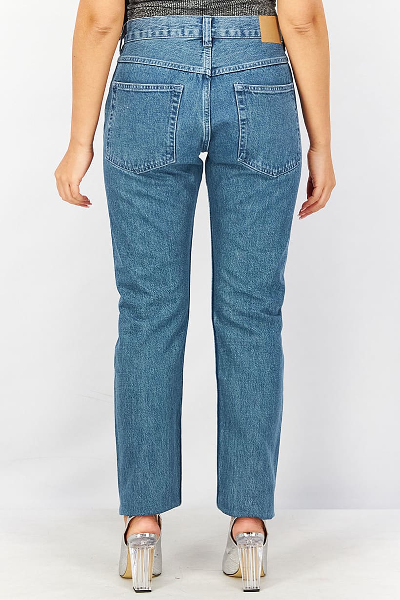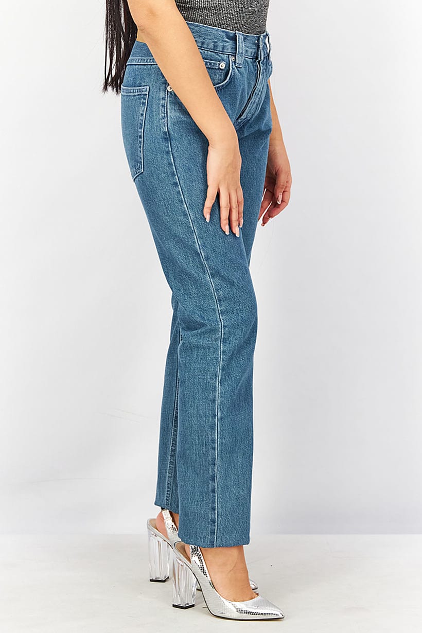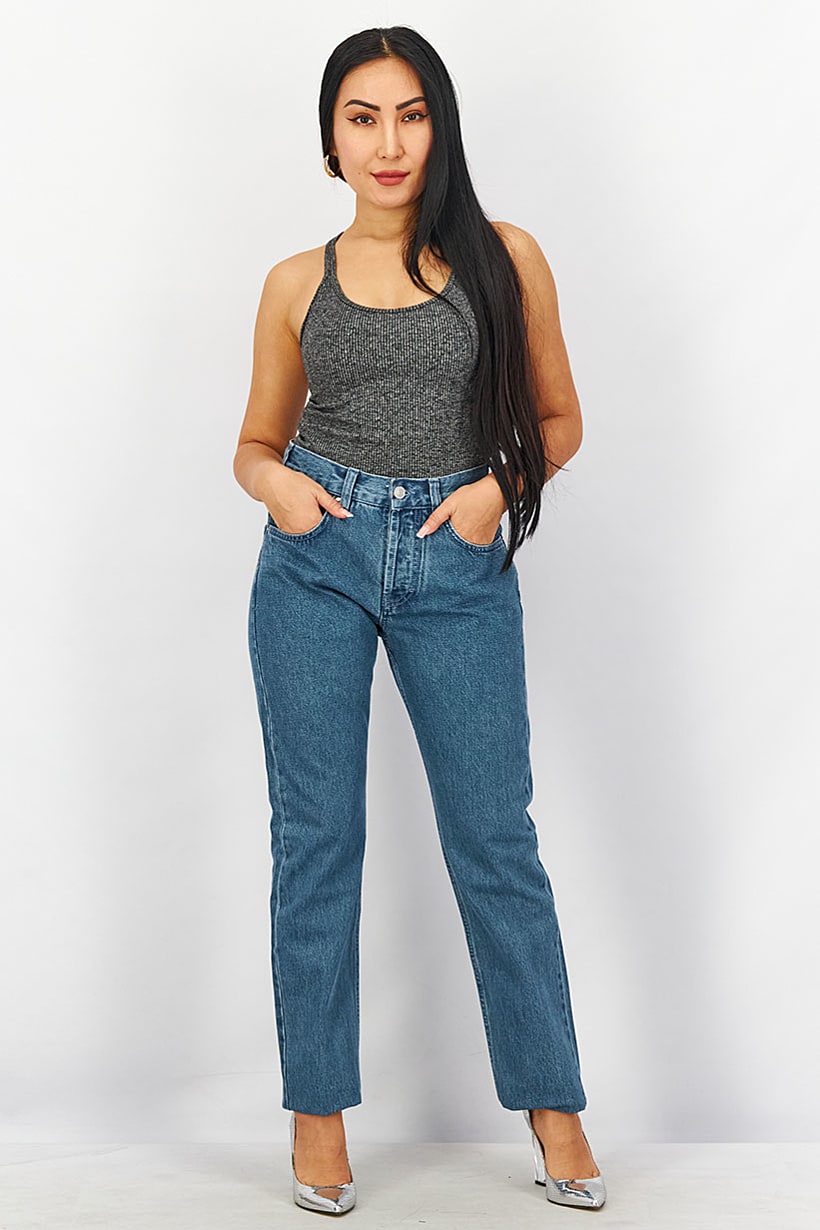 This product is a pair of women’s jeans with a straight leg style and a slim fit. It features a straight bottom hem and a zipper fly for bottom closure. The jeans have a five pocket style and are made of 100% cotton fabric. They are machine washable and ideal for casual occasions. The color family is blue and the pattern and print is washed. These jeans do not have any stretch type. The size shown is in US measurements.
