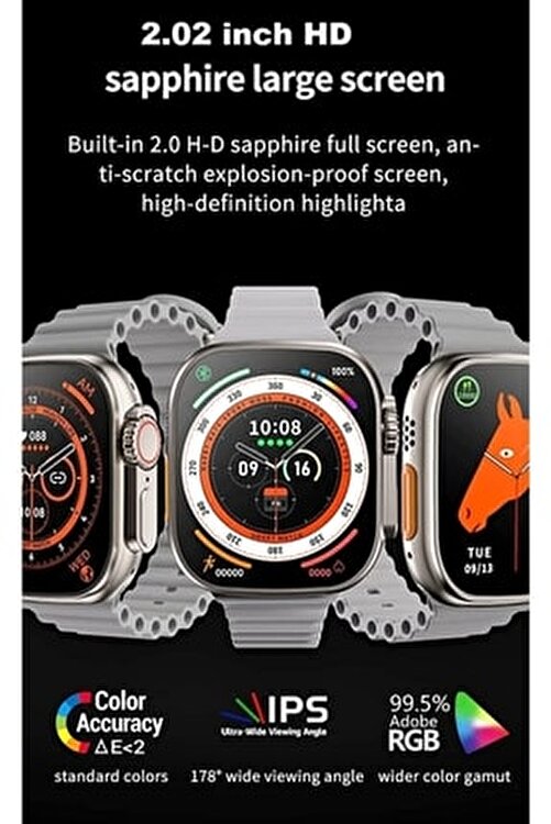 Foon Watch 8 ultra smart watch 49 mm iphone and andorid powered call specificity sensor smartwatch Give feedback Watch ultra smart watch product features full screen 49mm cord size right button left button and rotary key 3 keys feature freeze free screen music listening feature 8 people to guide add 8 people remote camera jogging cycling fitness basketball football volleyball sports modes siri feature lighting time feature language and time adjustment turkish polish bahamaca croatian slovenian arabic russian italian persian indonesian languages available dialing call feature heart rate measuring blood oxygen feature social media notifications feature telephonebul feature calculator feature weather feature ecg feature sleep mode accuracy plane mode feature feature to put pictures from app to screen blood pressure feature lanyard 45mm a is made as quality. Hiwatchpro program comes with a supported manual. Watch8 pro ultra smart watch