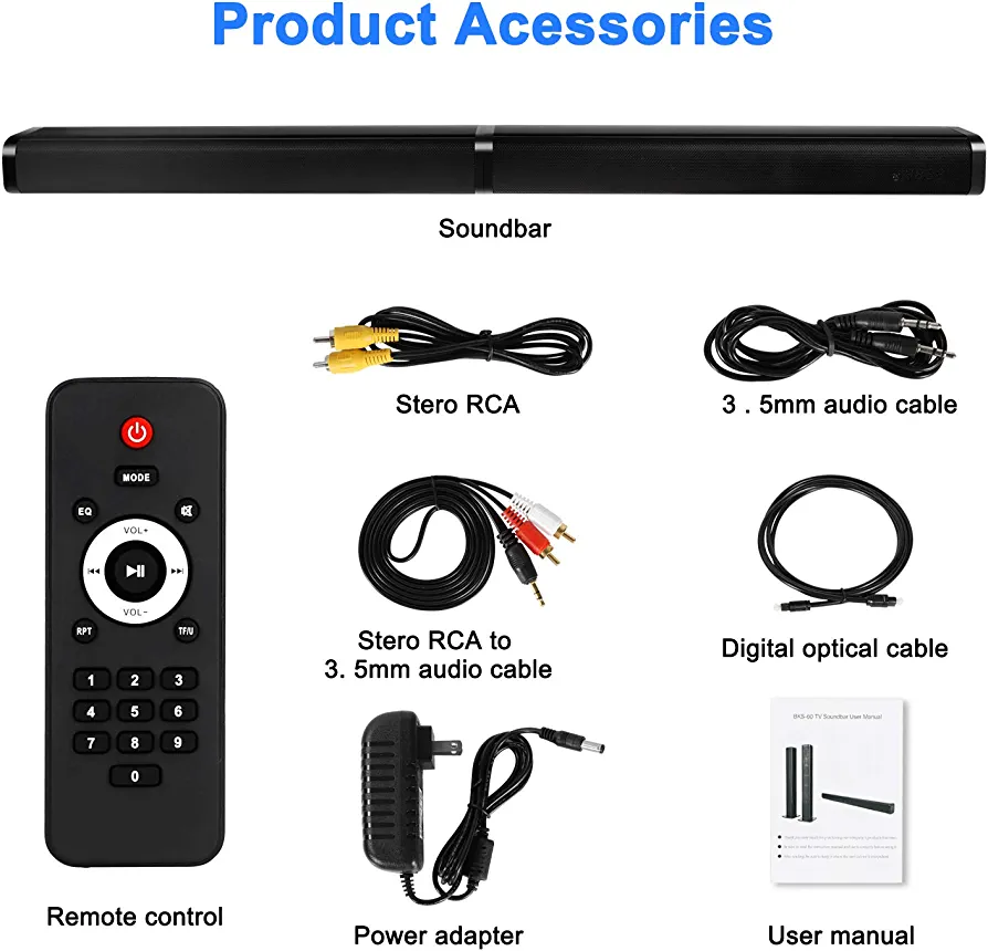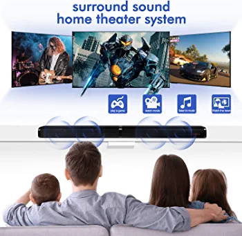 The Surround Sound Home Theater System for TV has four 2-inch 10W full-band high-quality speakers, 80dB sound pressure level, and powerful 2.0 channels, providing clarity and dynamic sound that surrounds the entire space. The product also comes with a remote control that allows you to switch songs, increase or decrease the volume, and switch AUX modes comfortably while lying on the sofa. Please note that the remote control requires a separate battery purchase.