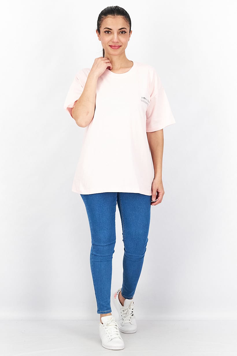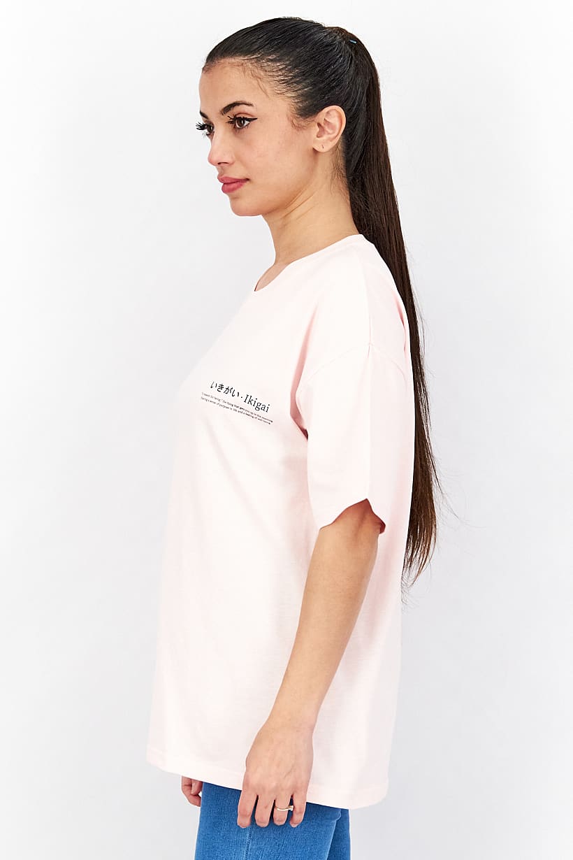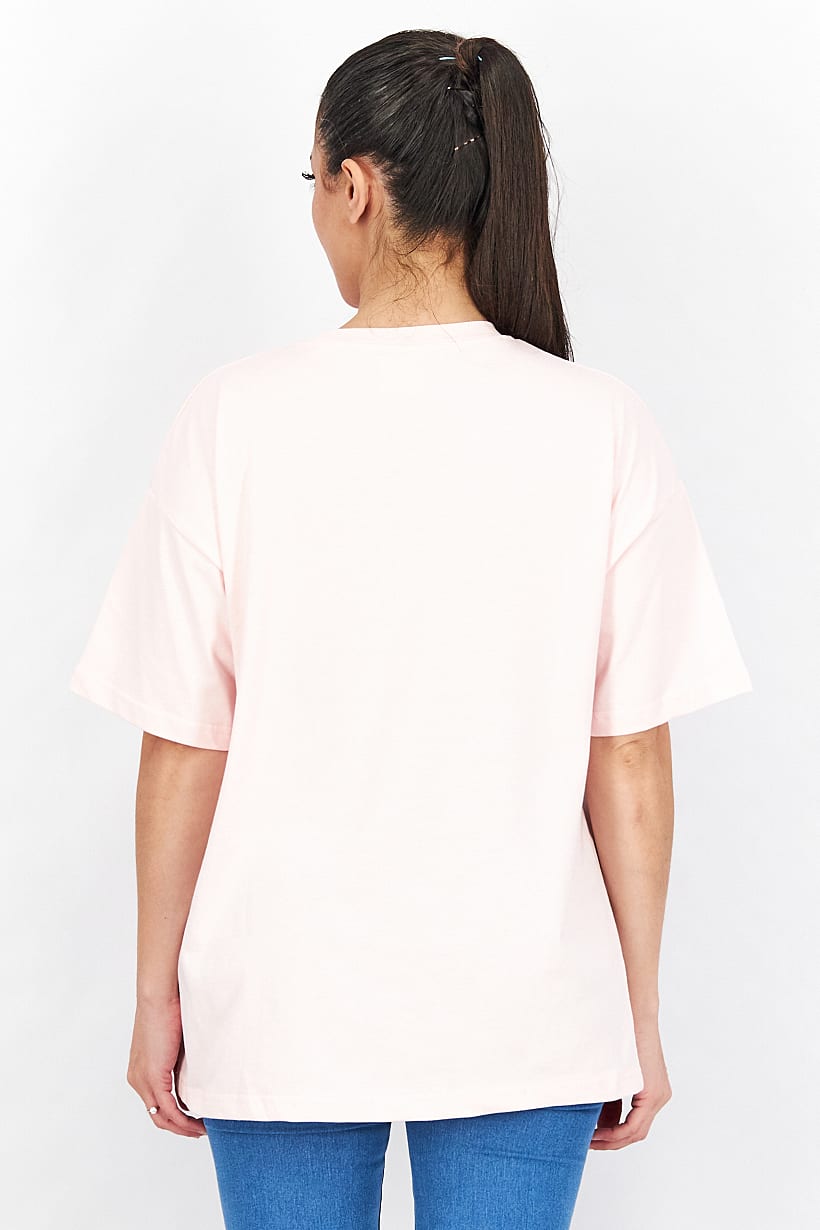 | descriptionOriginal | Care : Machine washable, Fit : Oversized Fit, Ideal For : Women, Size shown : International, Sleeve Length : Short Sleeve, Thickness : Light, Type of Sport : Training, Types of Hem : Straight hem, Types of Neckline & Collar : Crew neckline, Types of Sleeve : Short sleeve, Disclaimer : Product color may slightly vary due to photographic lighting sources or your monitor settings., Fabrics : 100% Cotton, Occasion : Casual, Pattern & Print : Graphic print, Sportswear Type : T-Shirt, Types of Closures : Pullover, Color Family : Pink, |