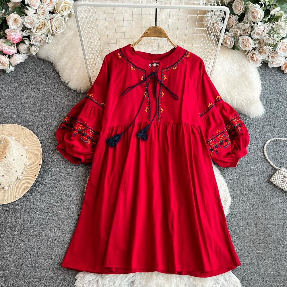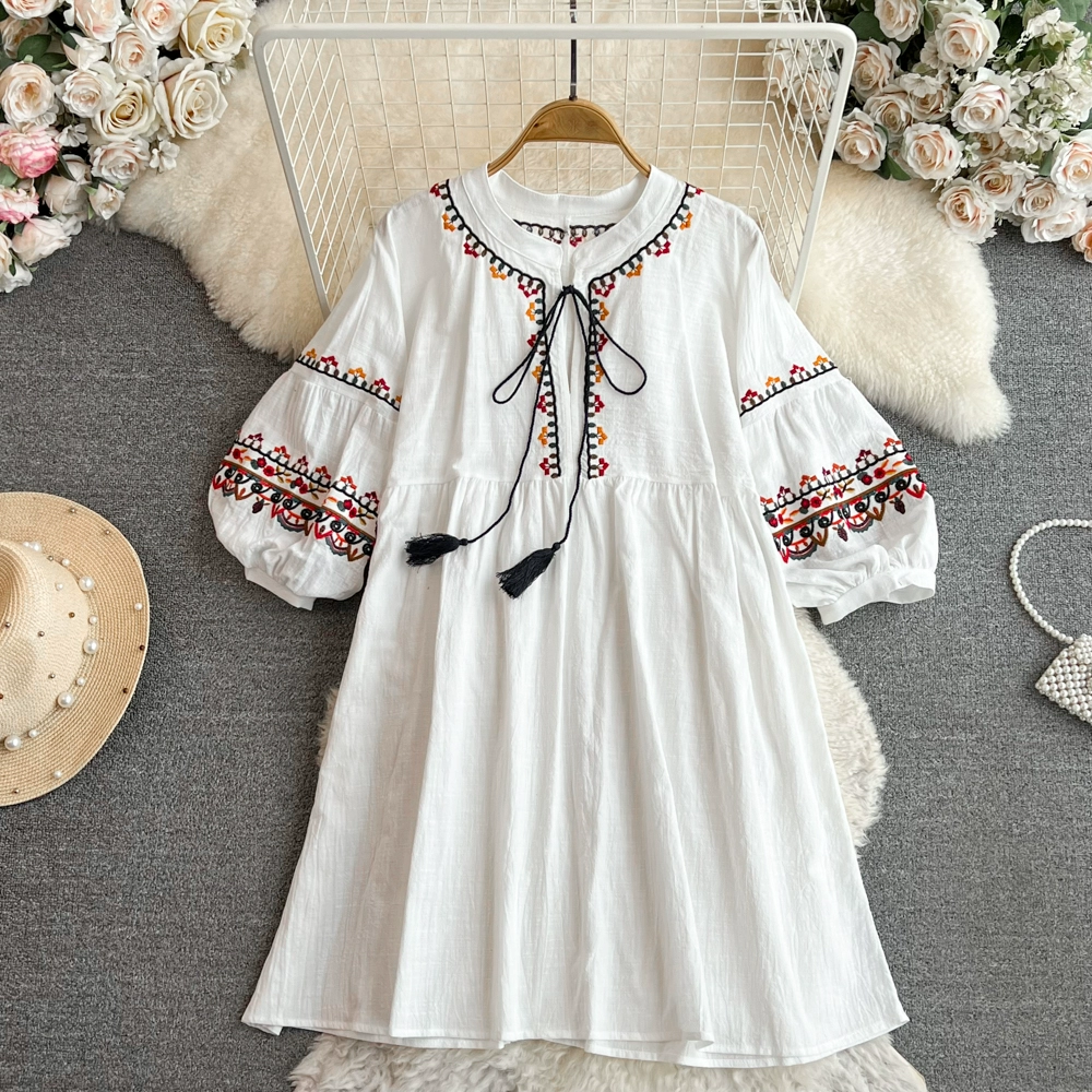 Boho cotton and linen fringed loose dress embroidered