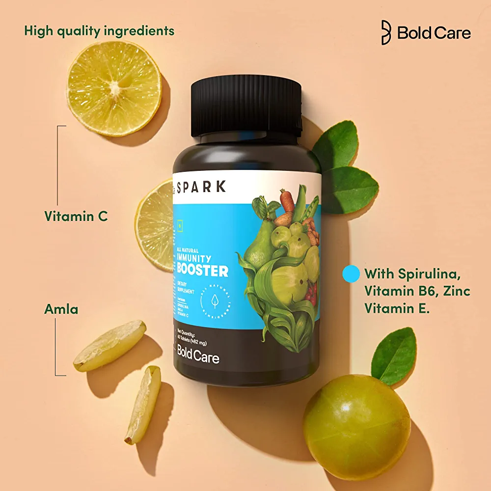 Bold Care Spark is an all-natural immunity booster supplement designed for both adults and kids. It contains a powerful blend of Spirulina, Amla, Vitamin C, Vitamin B6, Vitamin E, and Zinc, which work together to support your immune system and promote overall health. These tablets are perfect for daily use and can help you stay healthy and energized throughout the day. With 60 tablets per bottle, you can enjoy the benefits of Bold Care Spark for an extended period of time. So, if you’re looking for a natural way to boost your immunity and support your overall health, Bold Care Spark is the perfect choice for you.