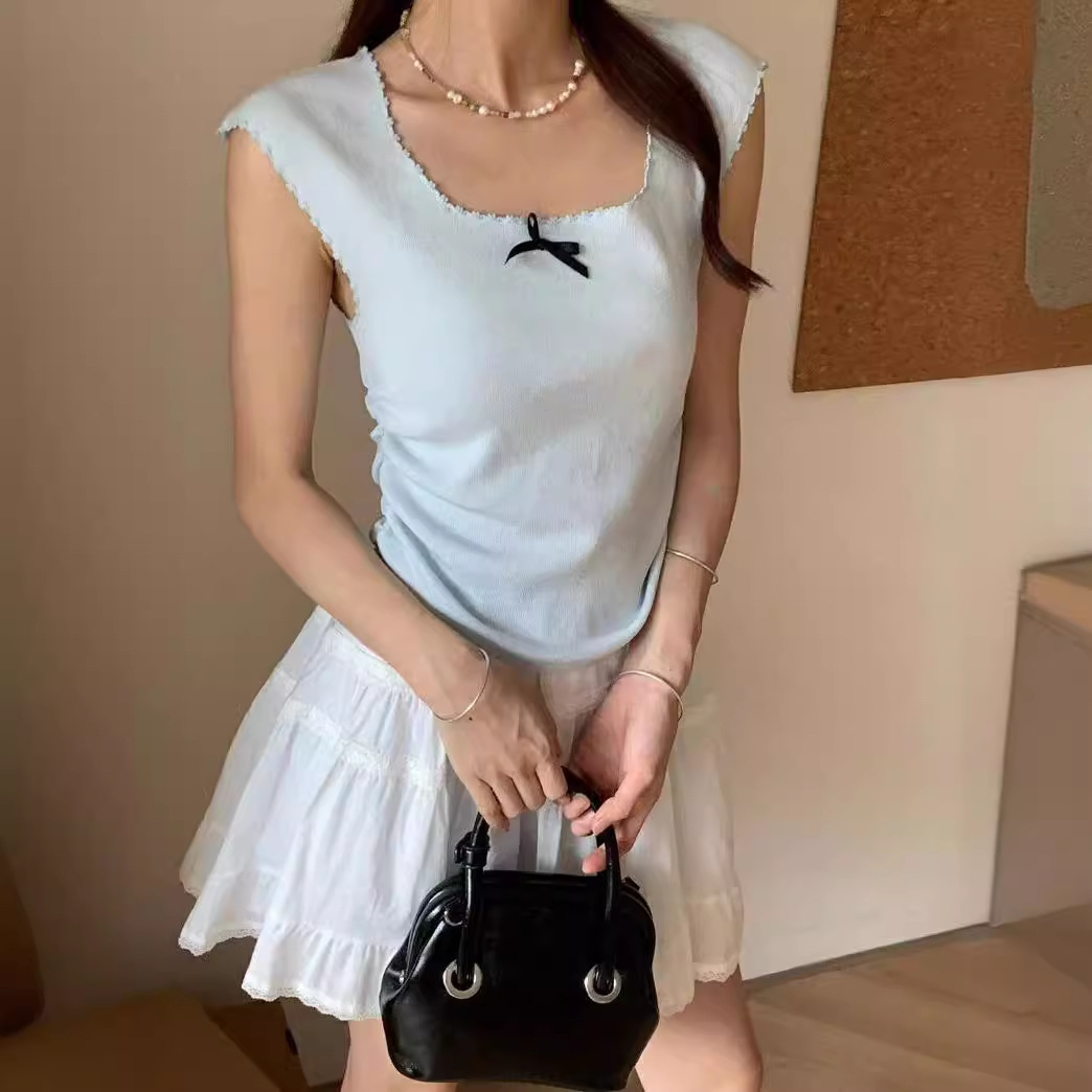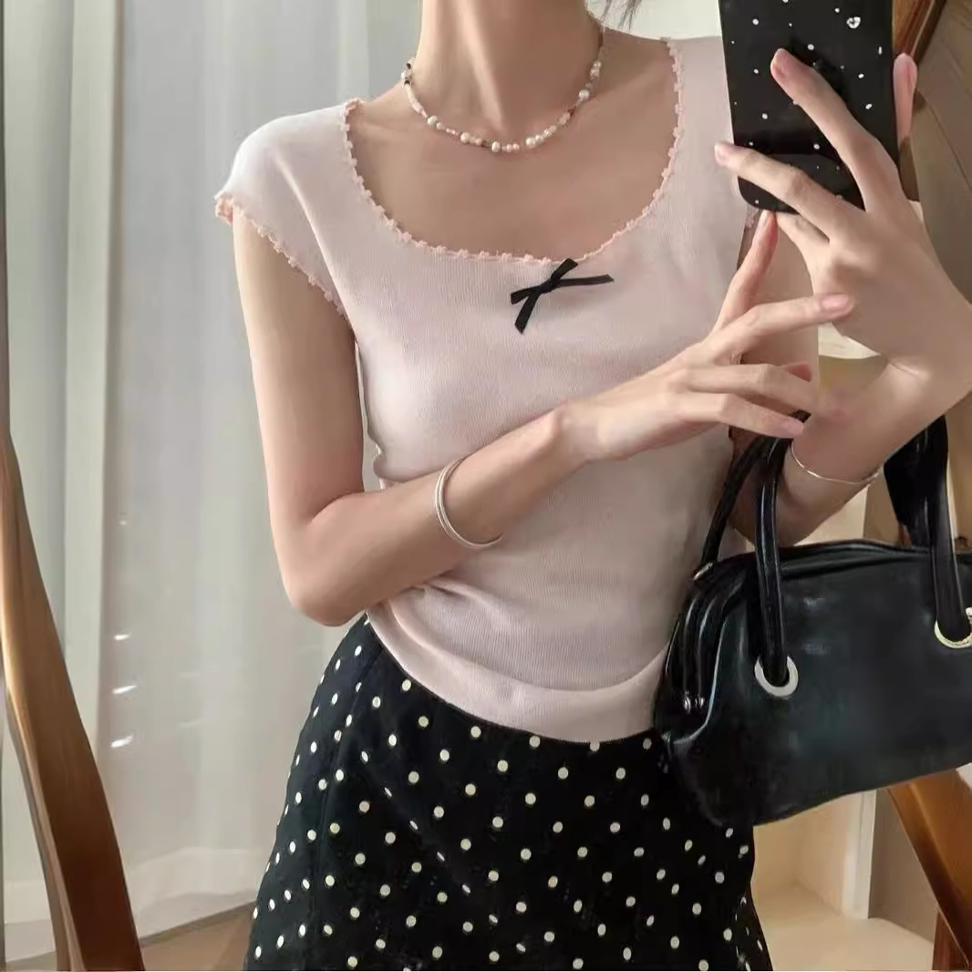 | nameOriginal | Bow Square Collar Short-sleeved Sweater Women's Summer New Korean Style Slim-fit Elegant All-match Irregular Top |