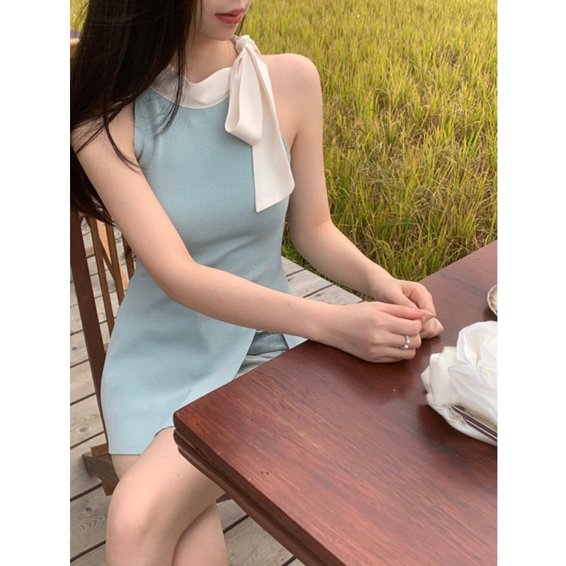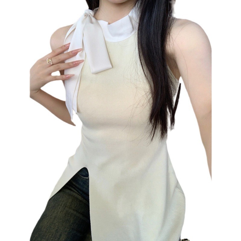 | nameOriginal | Bow Strap Color-matching Hanging Neck Sleeveless Vest Women's Outer Wear Summer Pure Sexy Split Slim Base Top |