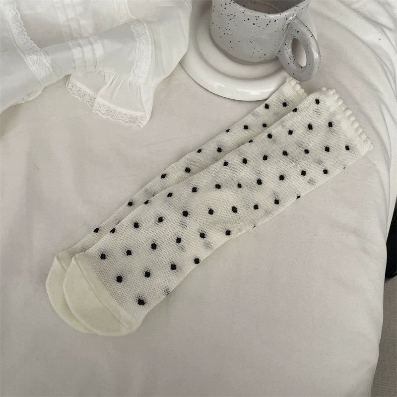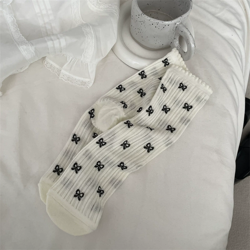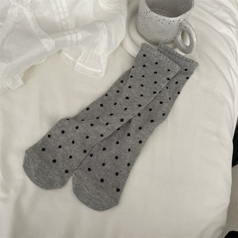 Bow-tie mid-calf thin gray polka dot Korean style socks