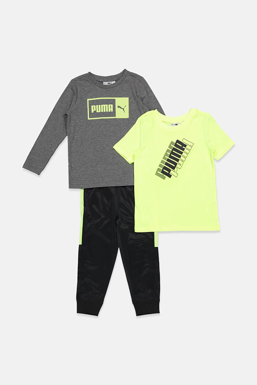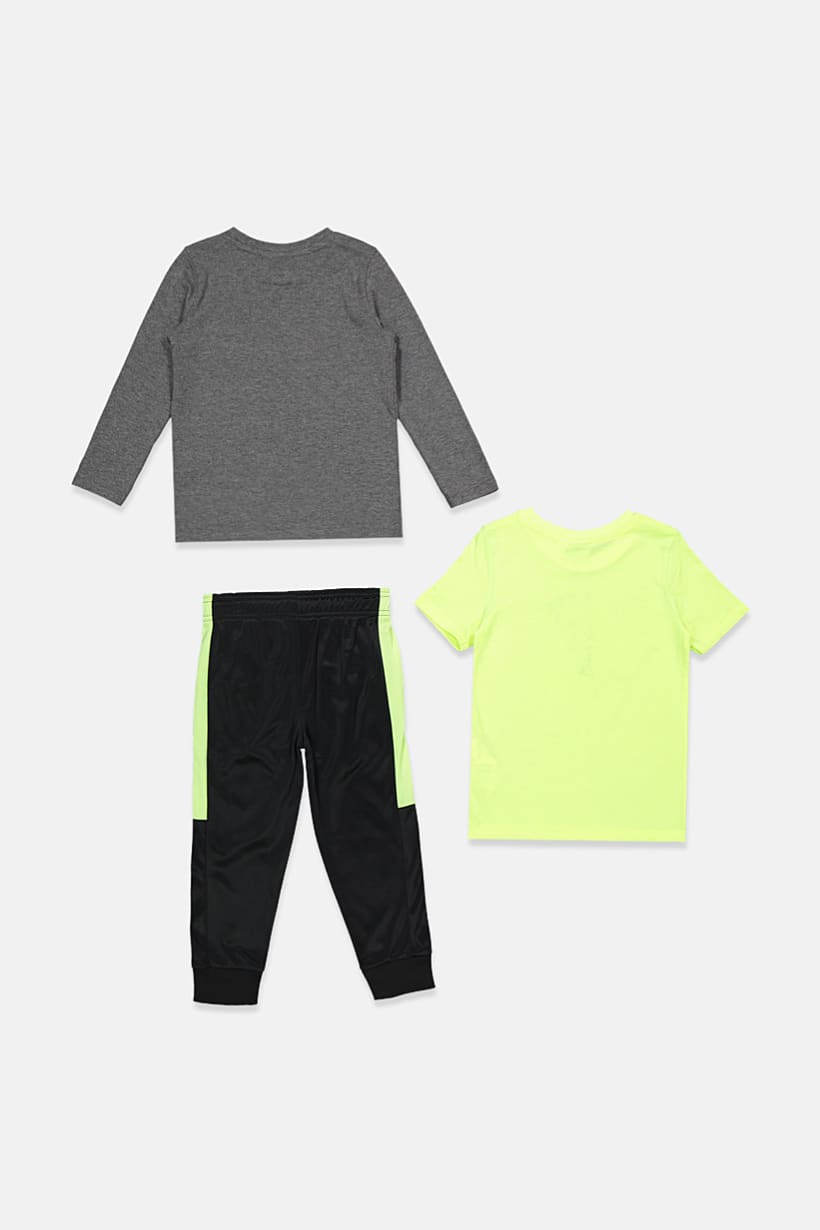 | sub_Categories | Boys Fashion, Boys Sportswear, kids boy 3 pcs brand logo graphic tee and pants set black and lime and grey |