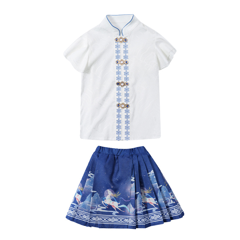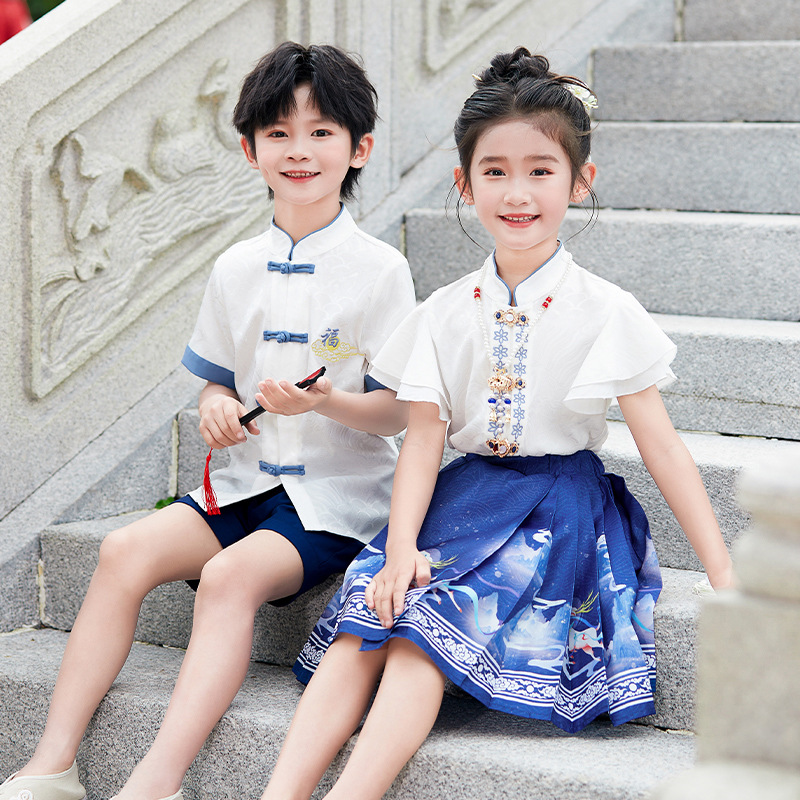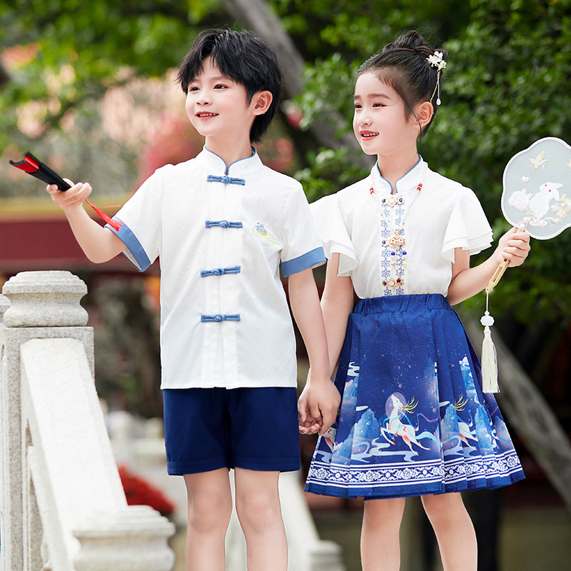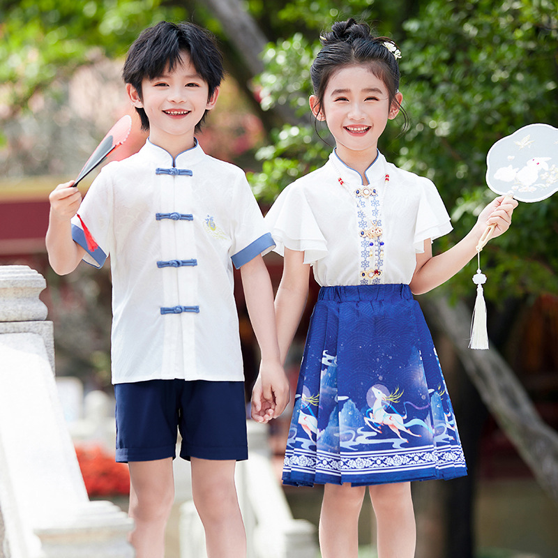 | nameOriginal | Boys and Girls Performance Clothes Primary School Students Recite Hanfu Children's Chinese Style Chorus Performance Clothes Summer Horse Face Skirt Tang Suit Summer |