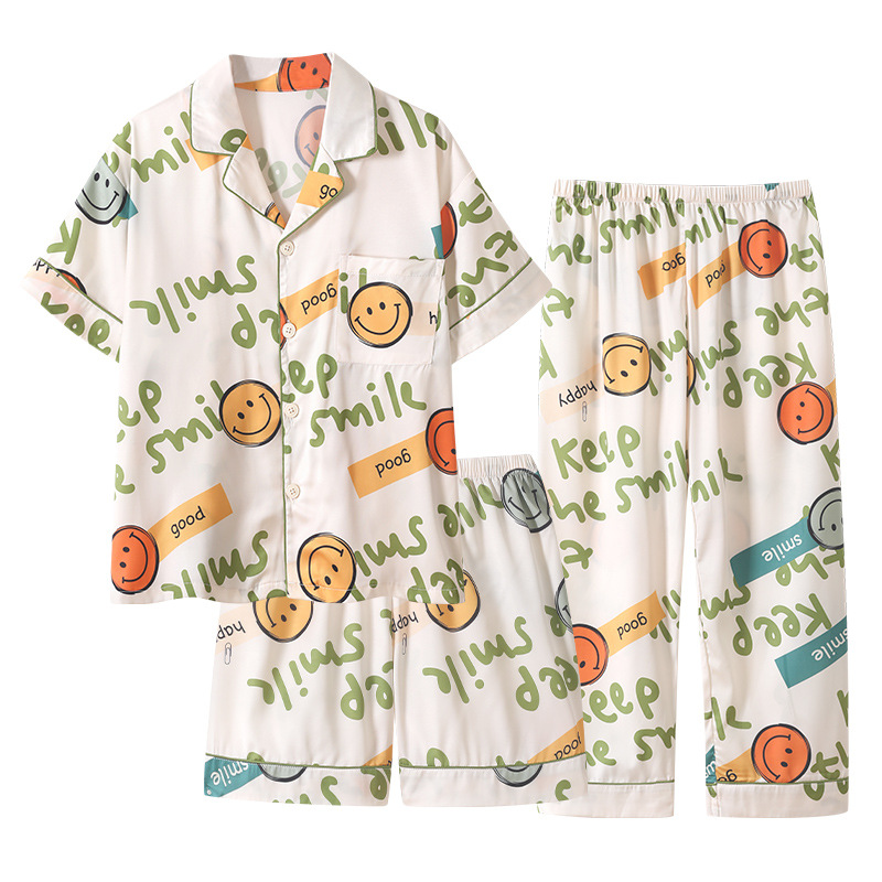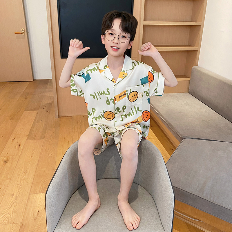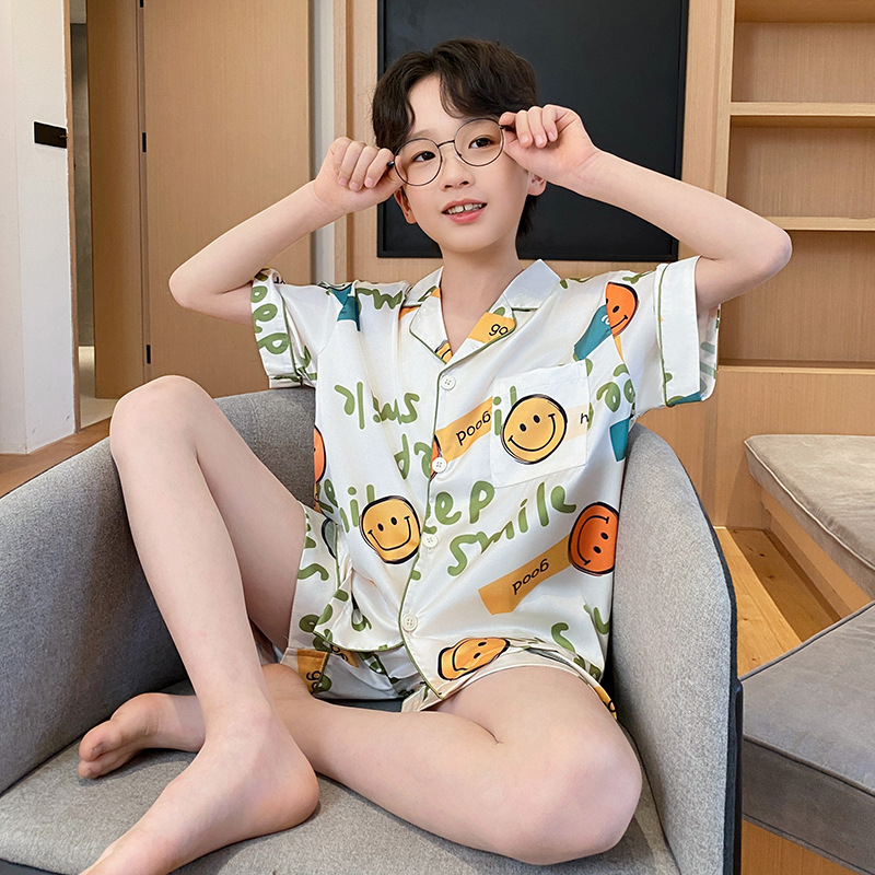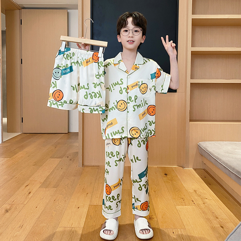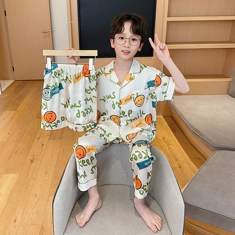 | nameOriginal | Boys' Ice Silk Pajamas Summer Short-sleeved Three-piece Suit for Large Children and Boys Cartoon Smiley Face Children's Thin Home Clothes |