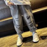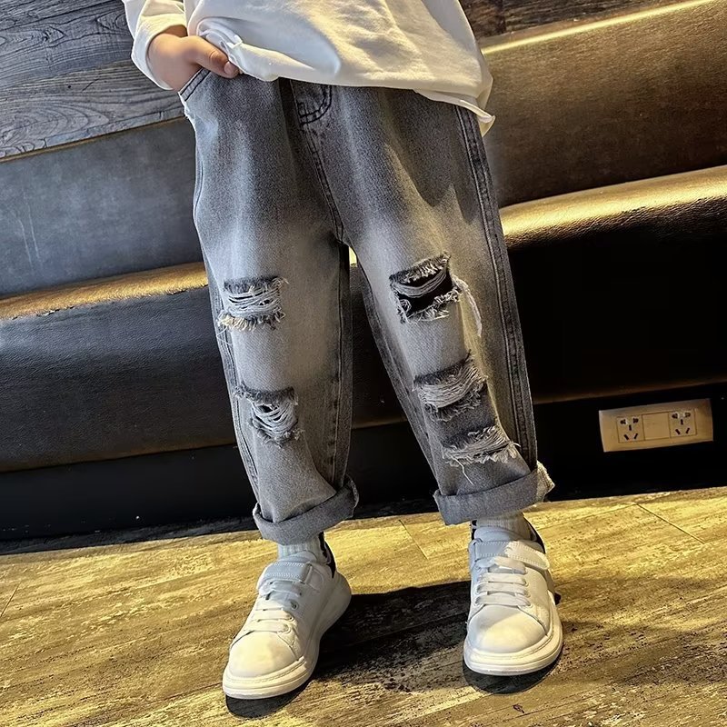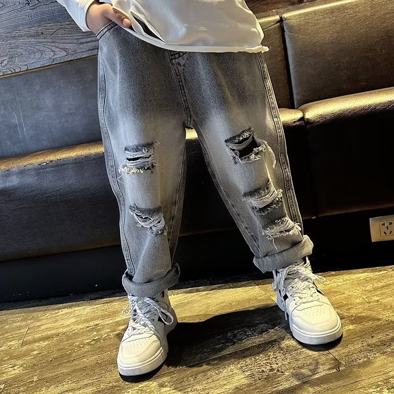 Boys’ Jeans Spring and Autumn 2024 New Arrival Ripped Straight Pants Loose Fashionable Handsome Street-Fried Children’s Trousers
