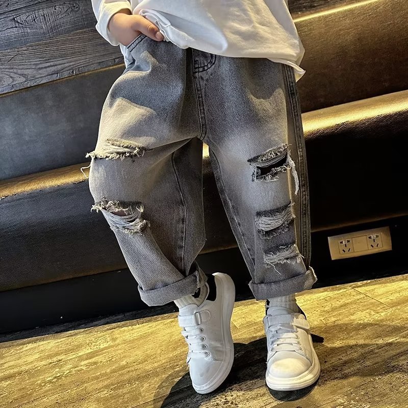 Boys' Jeans Spring and Autumn 2024 New Arrival Ripped Straight Pants Loose Fashionable Handsome Street-Fried Children's Trousers
