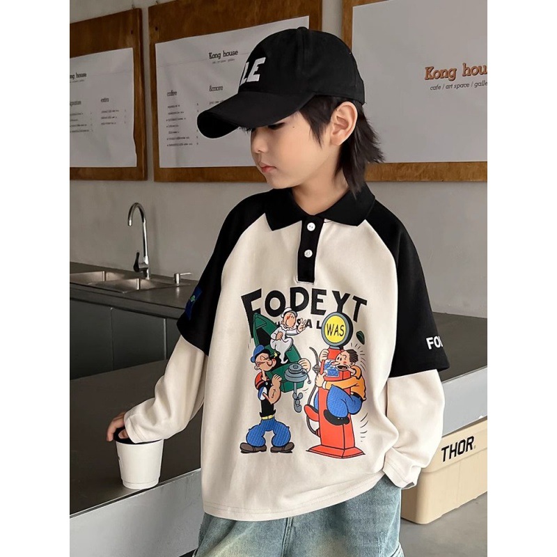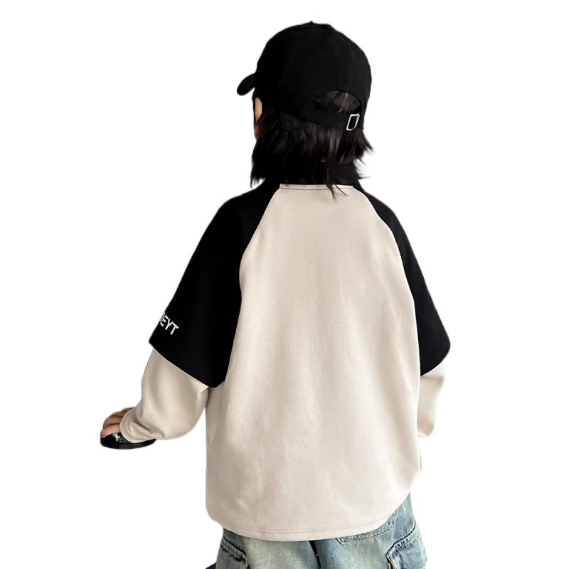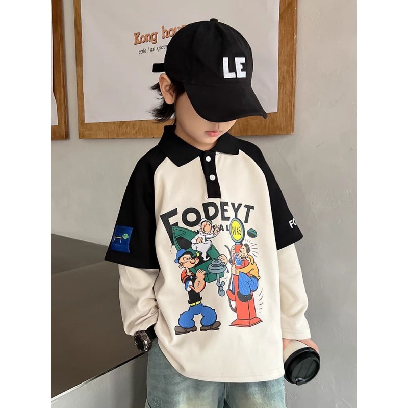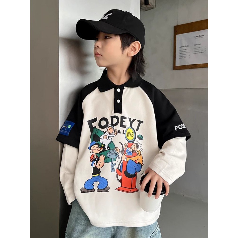 Boys’ Lapel Top Polo Shirt Spring and Autumn 2024 New Fake Two-piece Children’s Long-sleeved T-shirt Thin