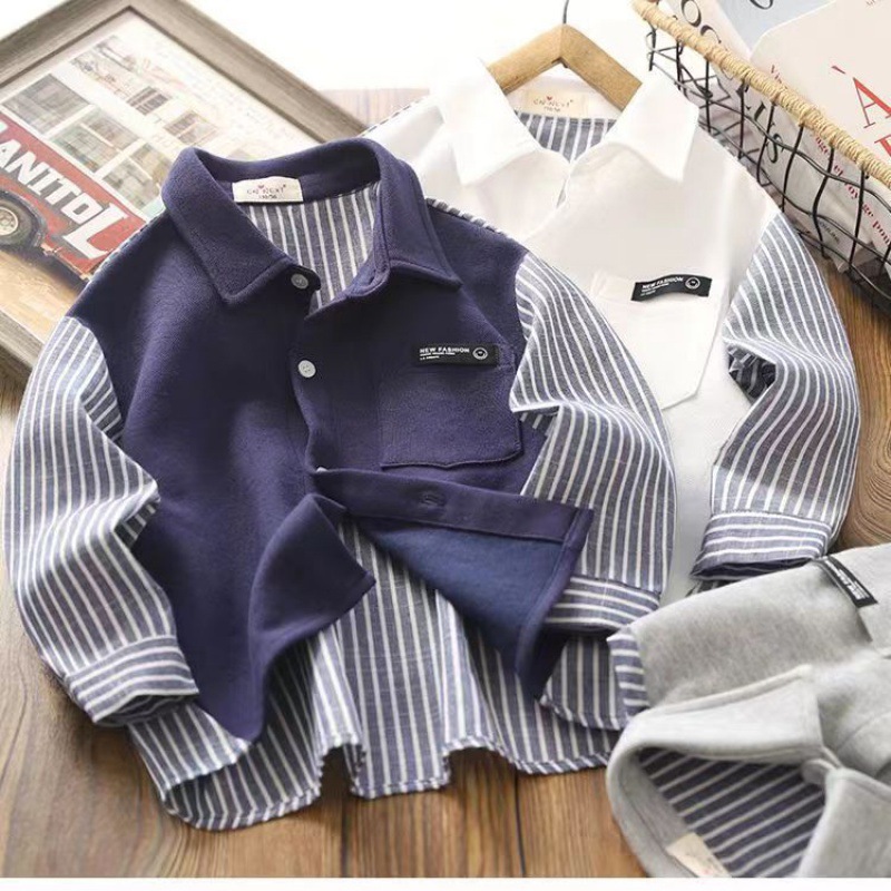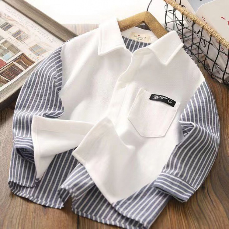 Boys' shirt spring 2023 Autumn New stitching button children's lapel fashion fake two-piece shirt fashionable fashionable top