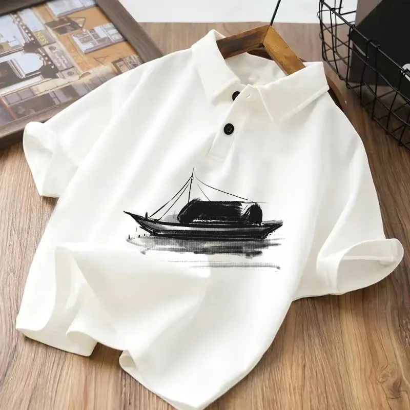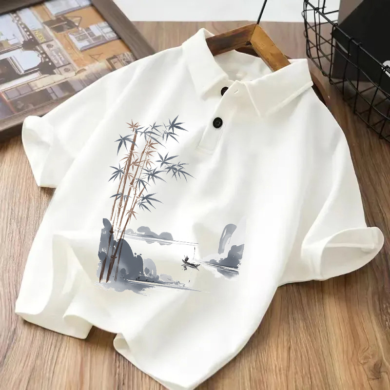 Boys' Summer Casual POLO Shirt Children's Wear Chinese Style Bamboo Leaf Short-sleeved T-shirt Big Kids White Lar Top