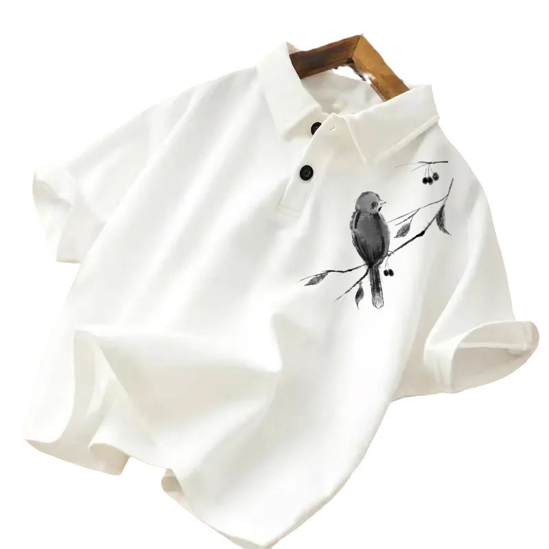 Boys’ Summer Casual POLO Shirt Children’s Wear Chinese Style Bamboo Leaf Short-sleeved T-shirt Big Kids White Lar Top