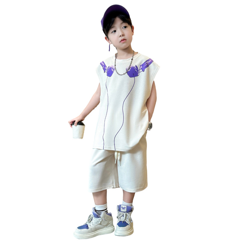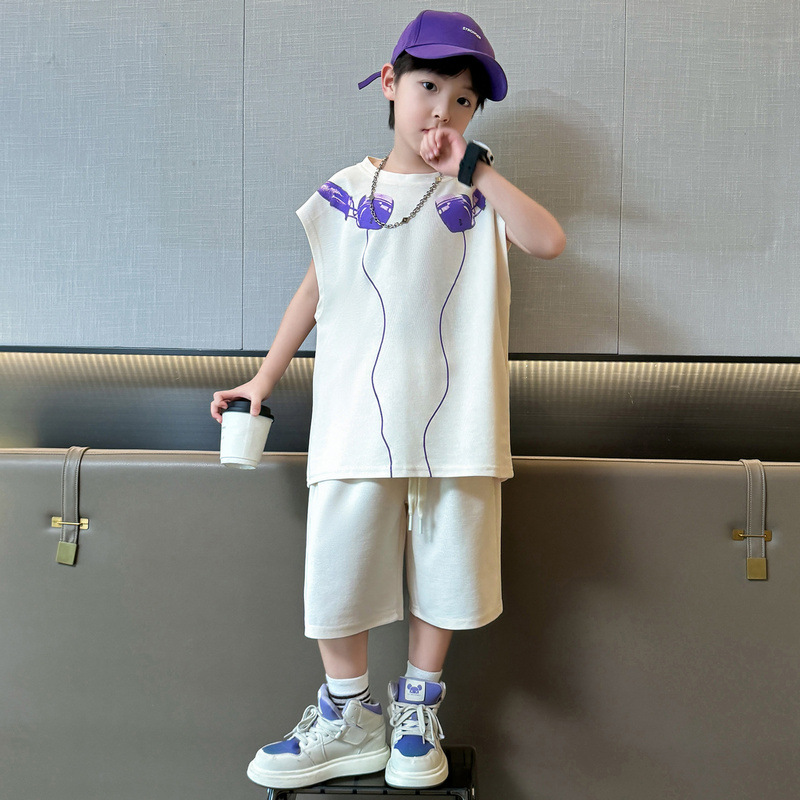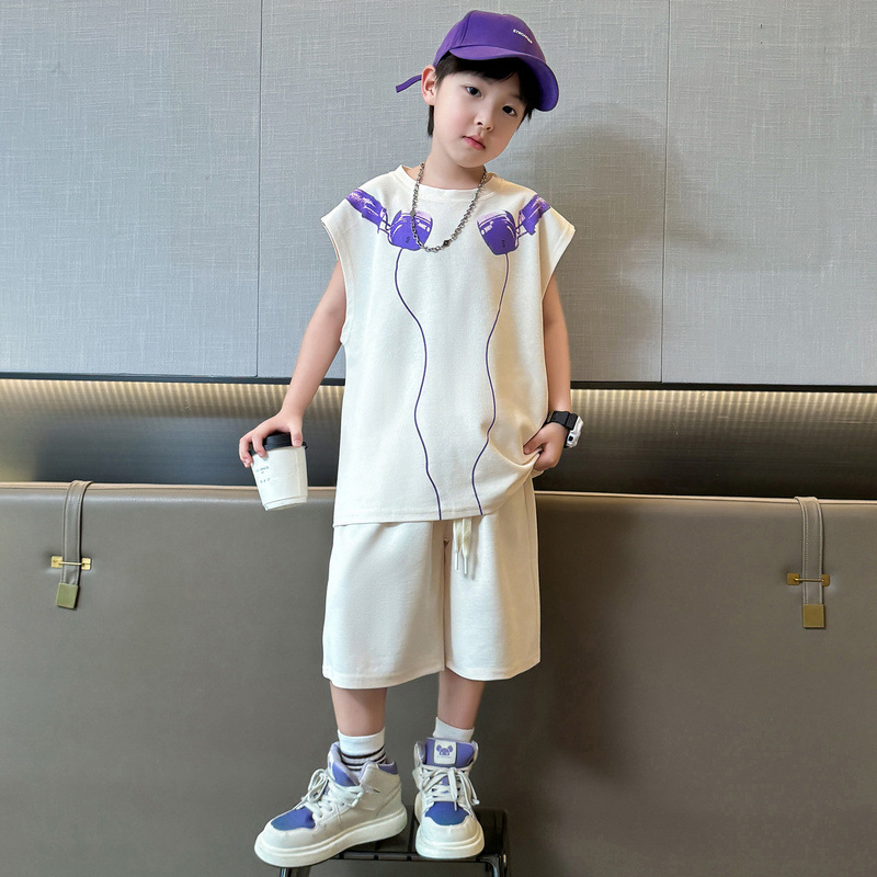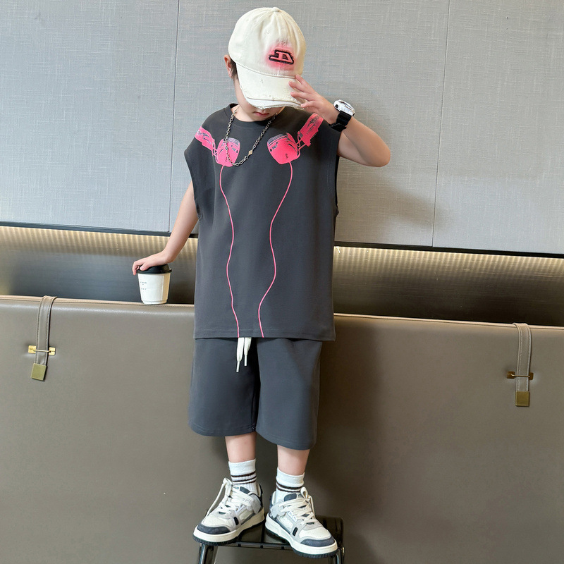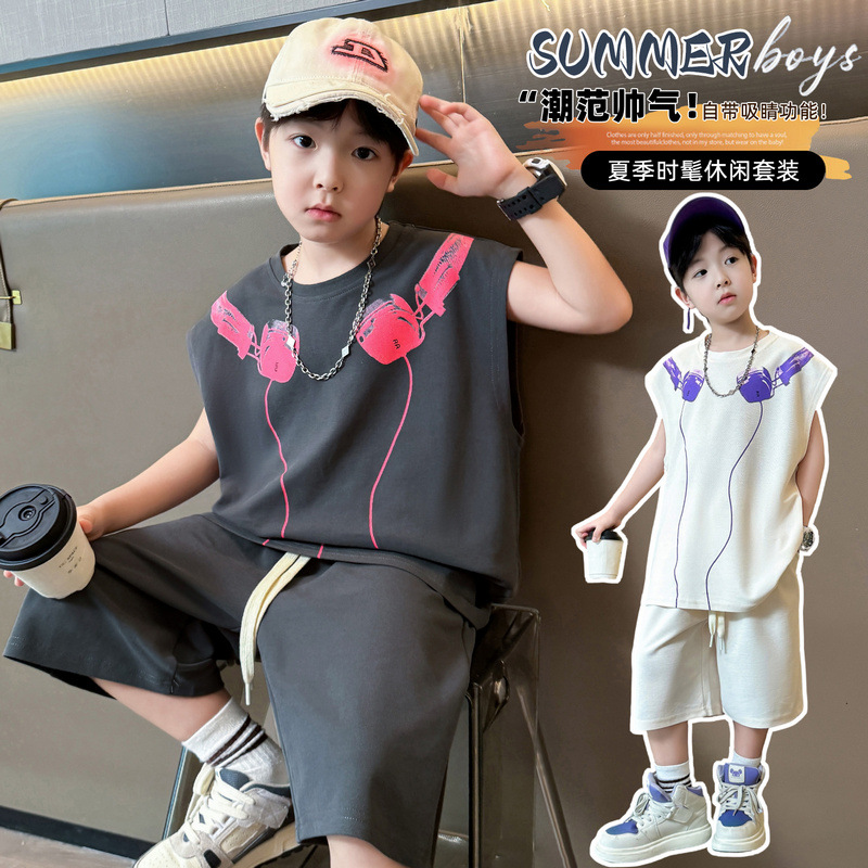 | nameOriginal | Boys summer sports suit 2024 new large children's headphones printed sleeveless vest loose pants two-piece set |