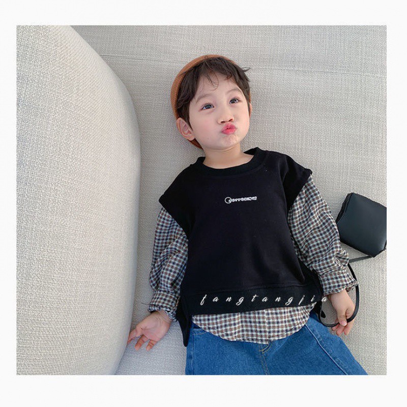 Boys' Sweater Baby's Spring and Autumn 2024 Korean Style Fake Two-Piece Stylish Plaid Top Children's Fashionable Base Shirt