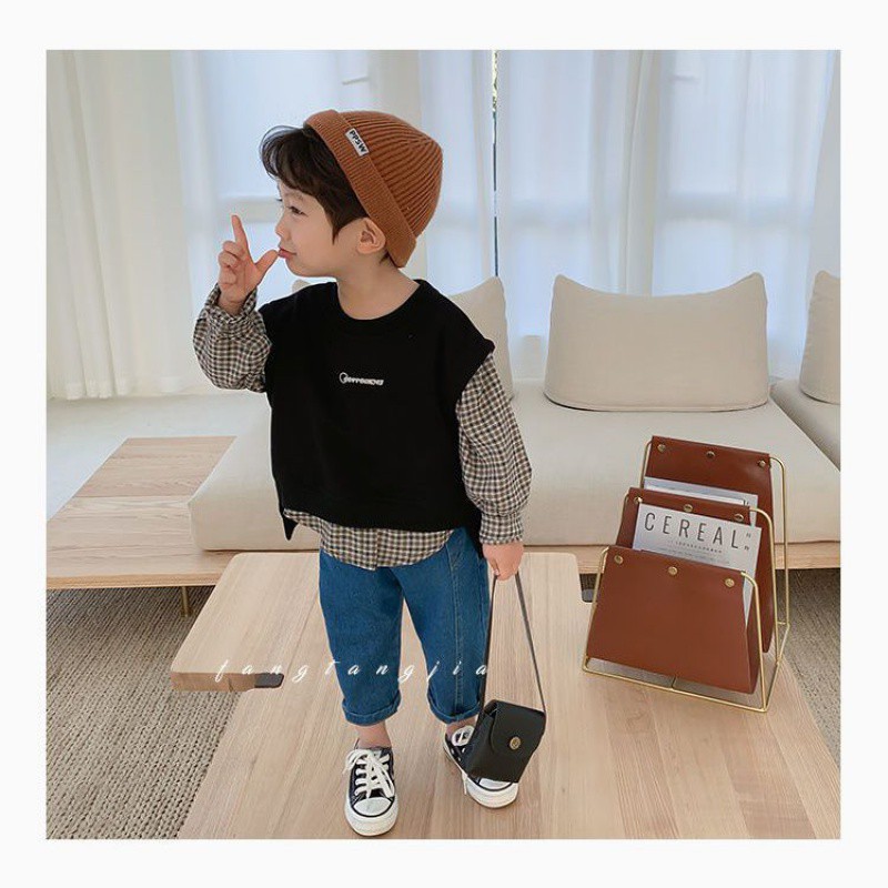 Boys’ Sweater Baby’s Spring and Autumn 2024 Korean Style Fake Two-Piece Stylish Plaid Top Children’s Fashionable Base Shirt