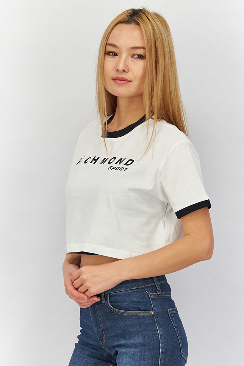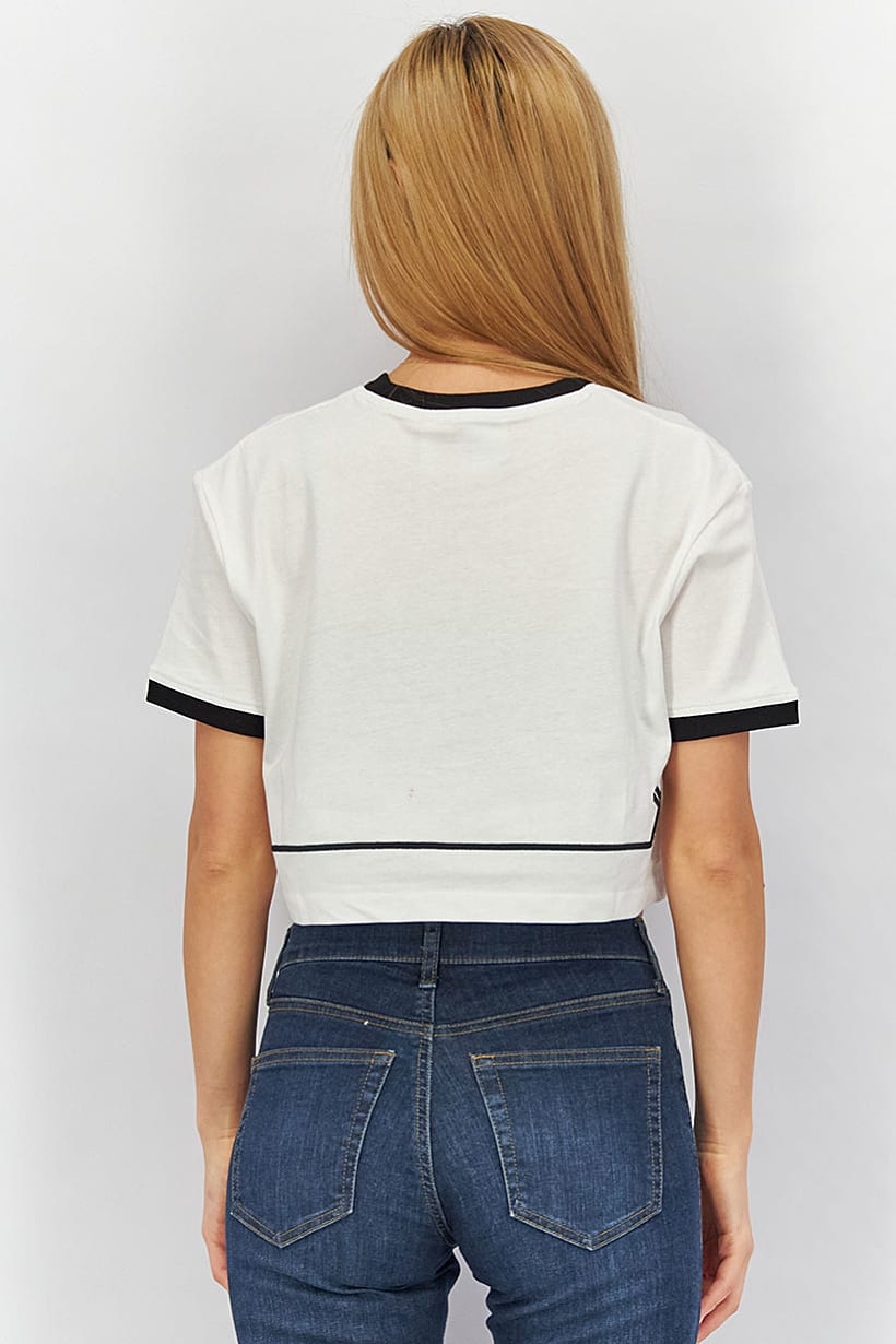 Women Sport Fit Crew Neck Brand Logo Crop Top, White and Black