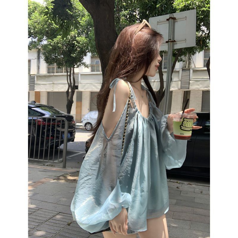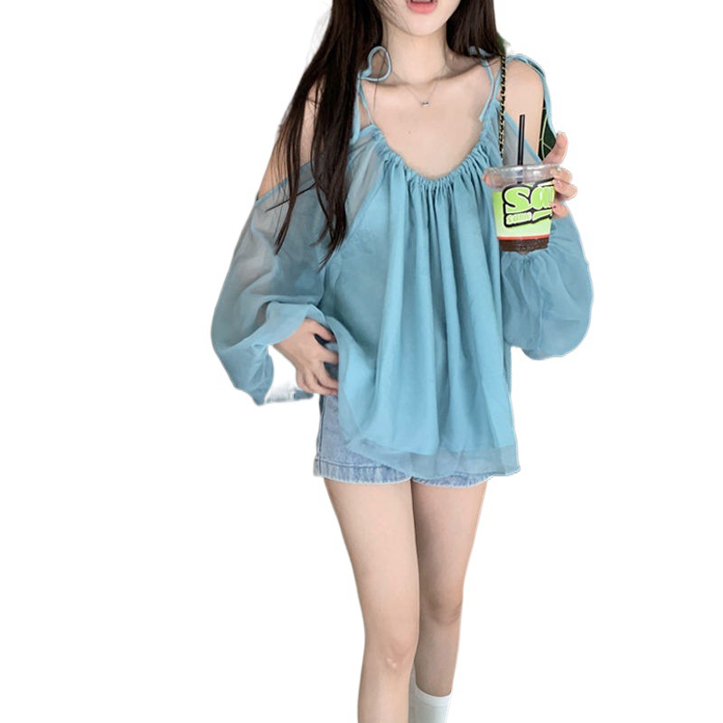 | nameOriginal | Breathable off-shoulder Temperament Lantern Sleeve Sling Sunscreen Shirt Women's Summer Gentle Style Pleated Loose Slim Thin Top |