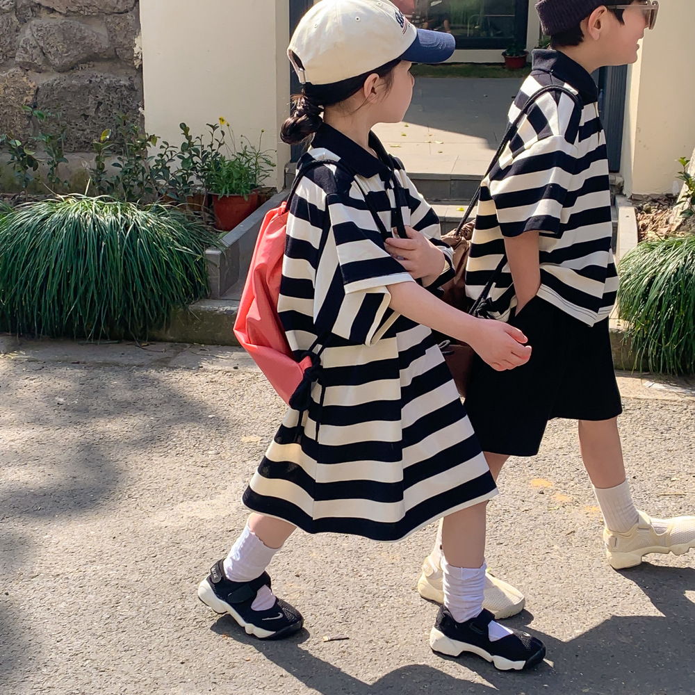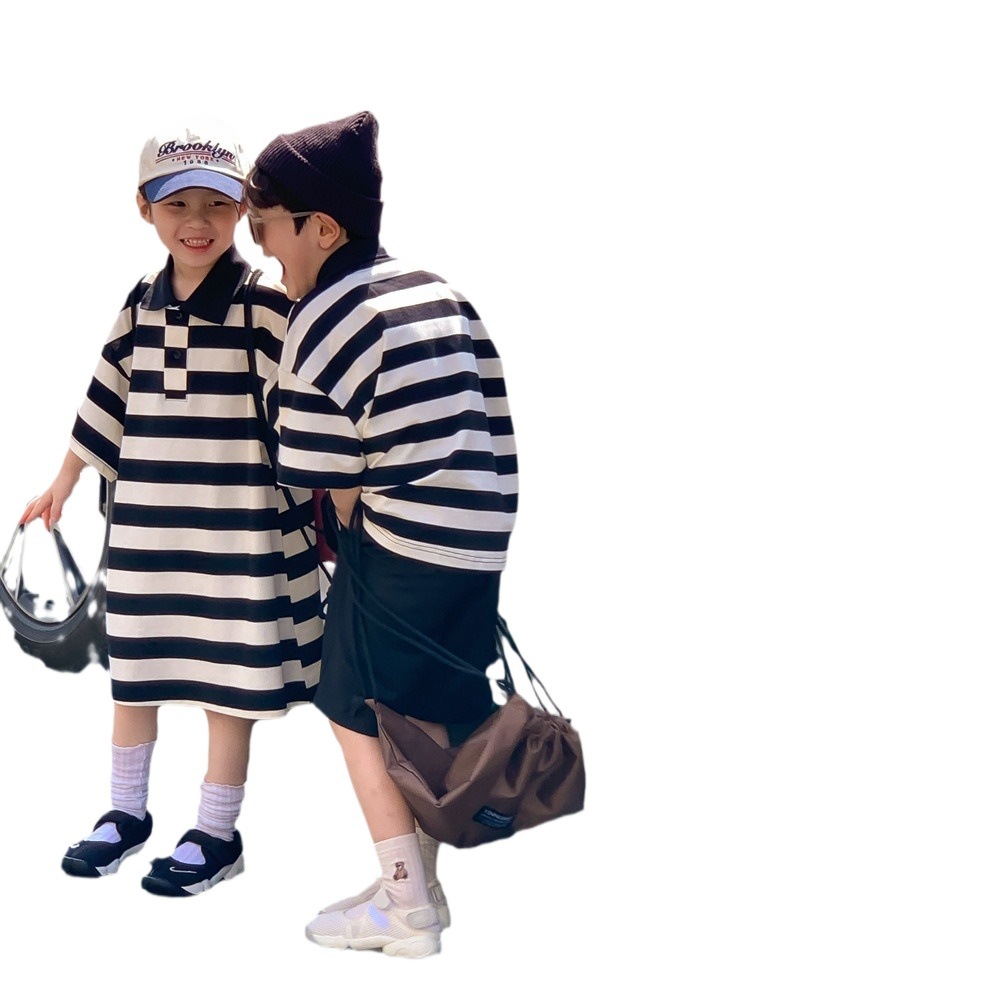 | nameOriginal | Brother and sister's 2024 summer boys' and girls' Korean version of loose polo collar small shirt striped dress end small Meng |
