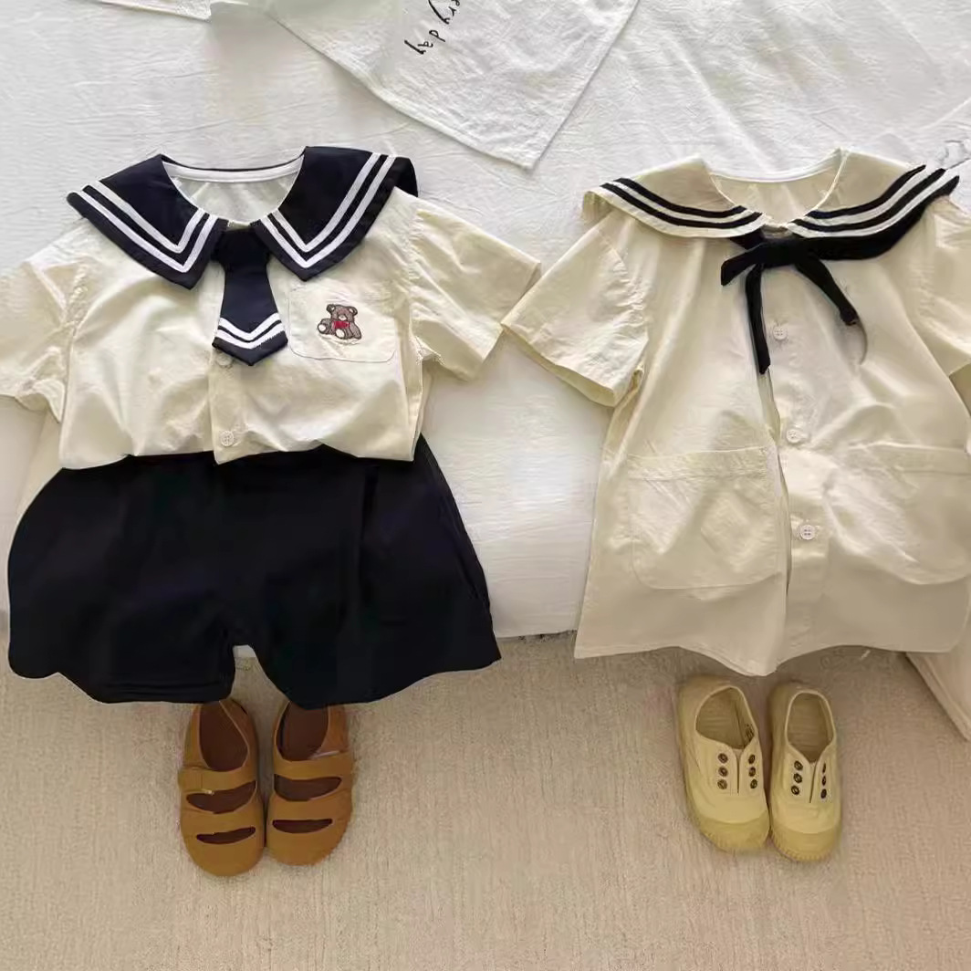 Brother and Sister's Children's College Style Set Boy's Navy Collar Short Sleeve Shirt Shorts Girl's Short Sleeve Dress Set