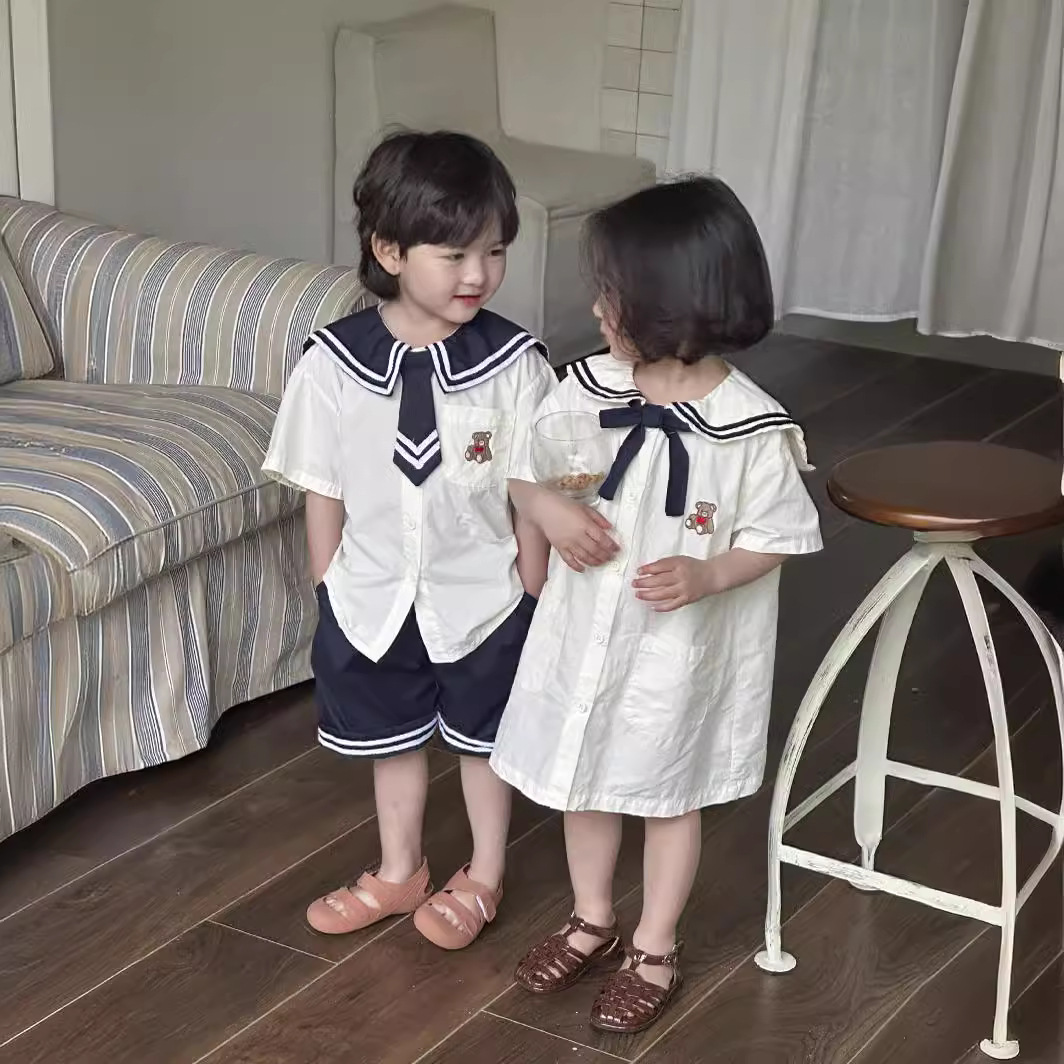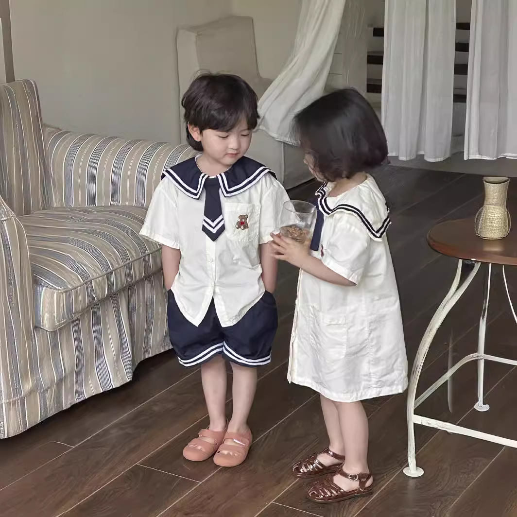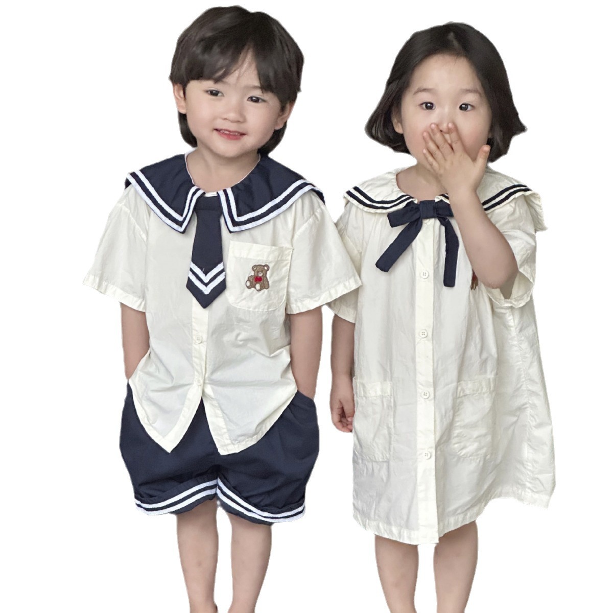 Brother and Sister’s Children’s College Style Set Boy’s Navy Collar Short Sleeve Shirt Shorts Girl’s Short Sleeve Dress Set