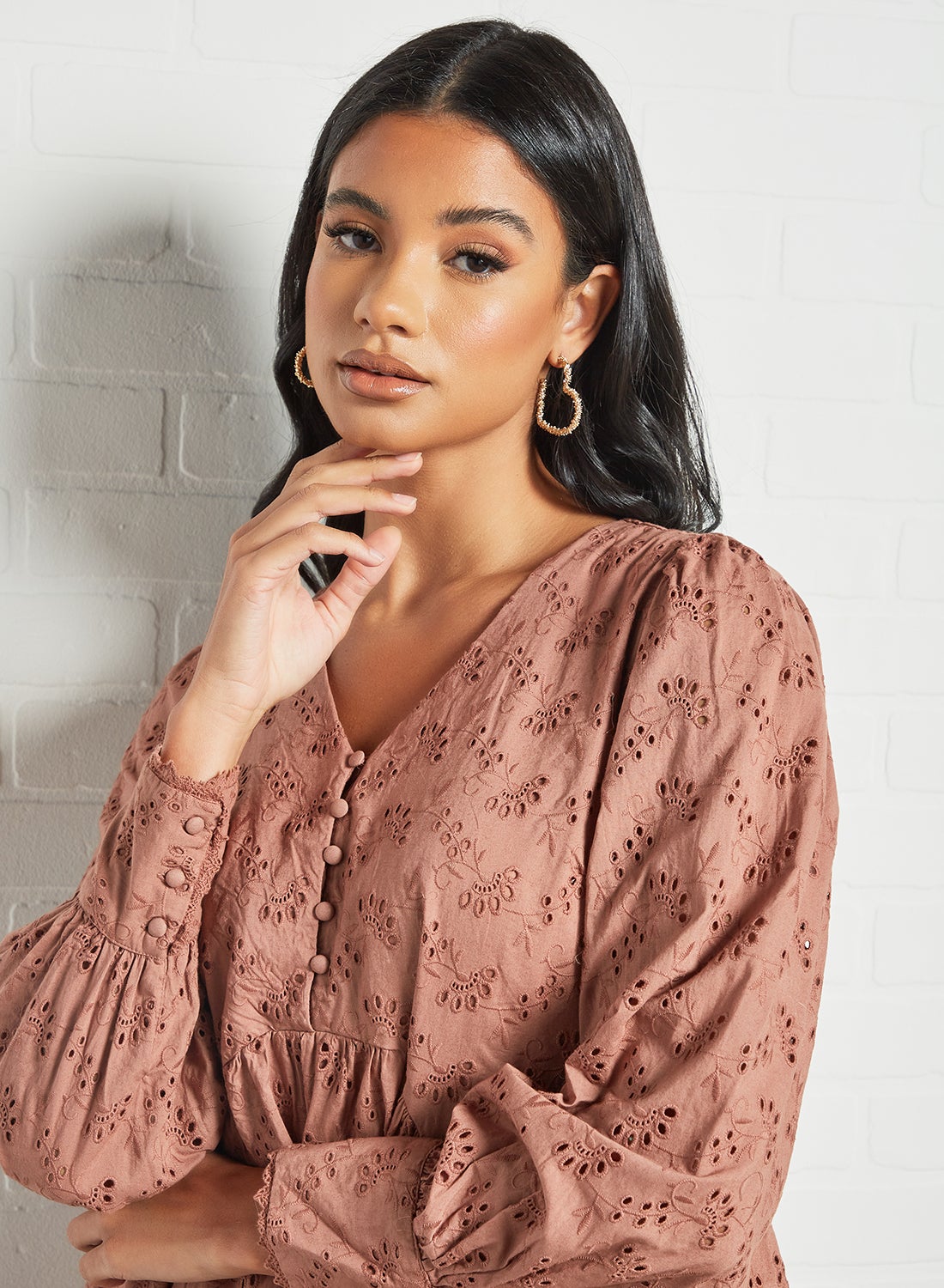 This product boasts a luxurious feel with its organic cotton material that is both comfortable and soft to the touch. The intricate broderie detailing is present throughout the garment, adding a touch of elegance. The V-neck and puffed long sleeves provide a flattering silhouette, while the button placket to the front adds a touch of sophistication. To ensure the longevity of the garment, please follow the care label instructions when washing.