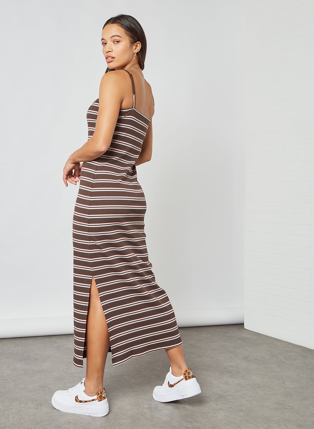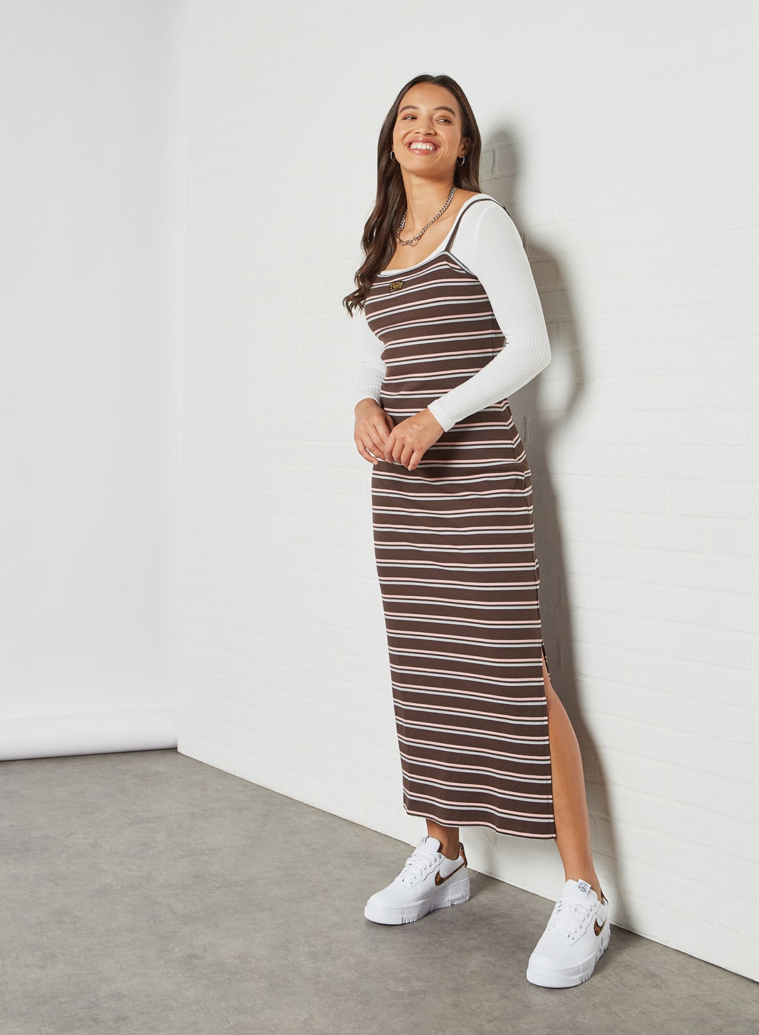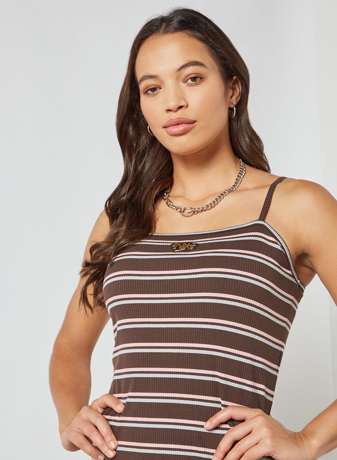This product features a cotton blend fabric that is both soft and comfortable. It boasts a striking stripe print throughout and a square neckline with slim shoulder straps. The tight fit ensures a body-hugging feel, while the Nike signature branding adds a touch of style. To keep this item looking its best, please follow the care label instructions when washing.