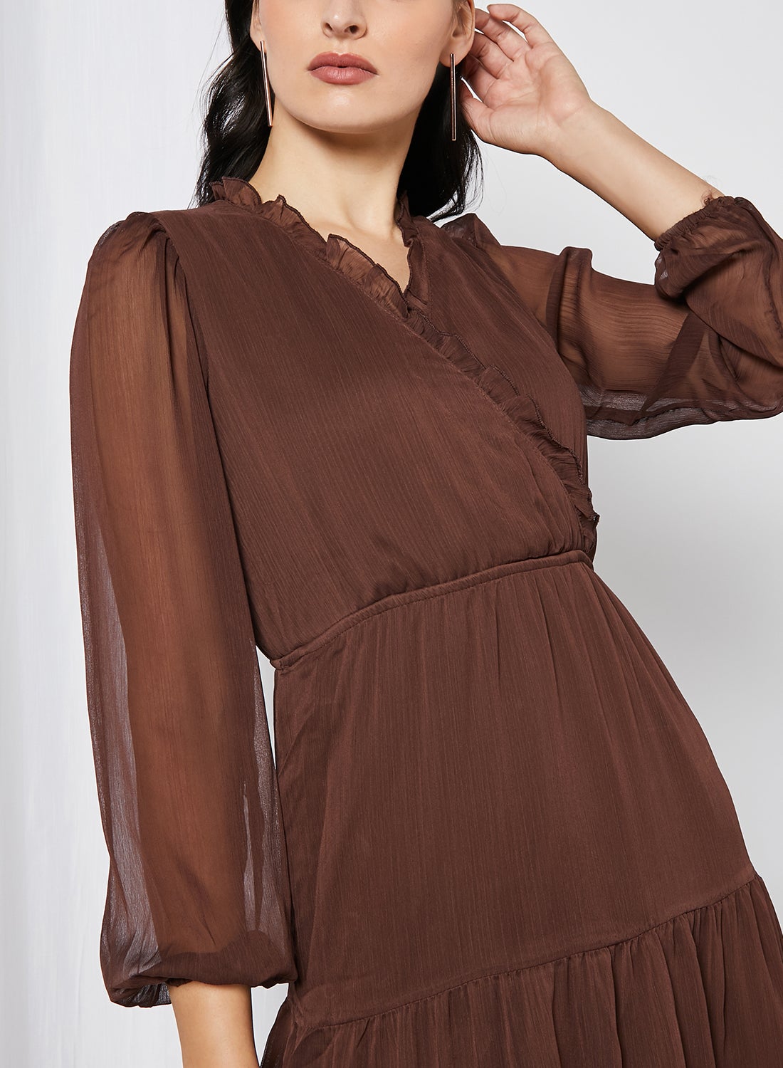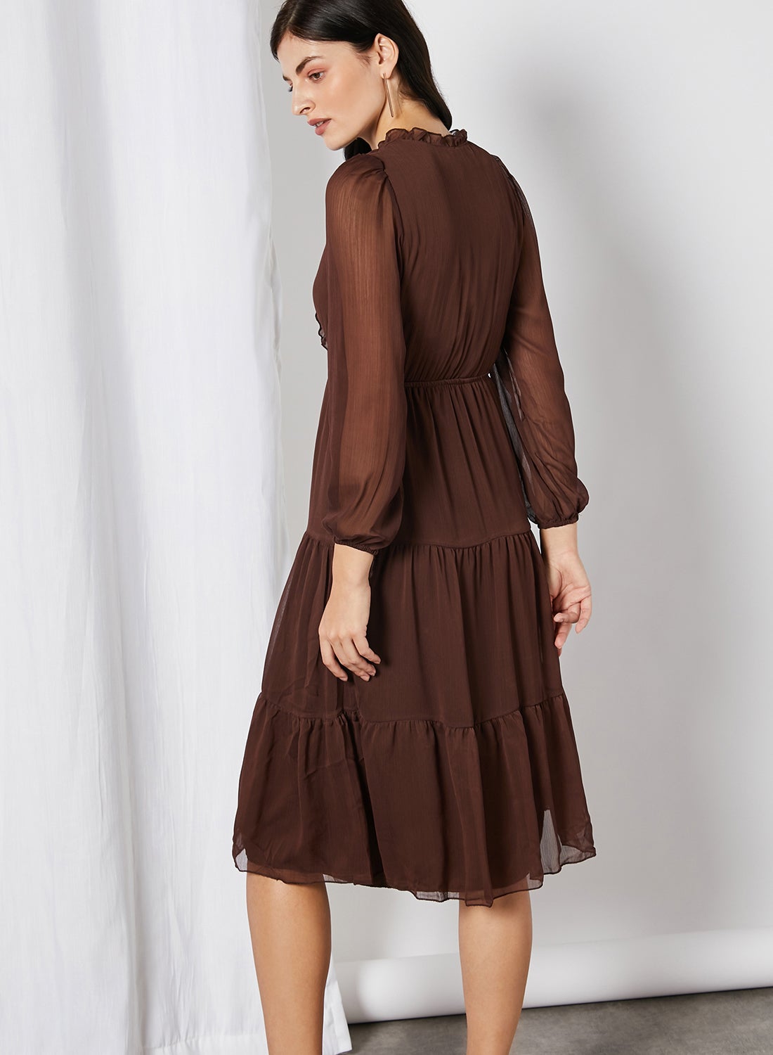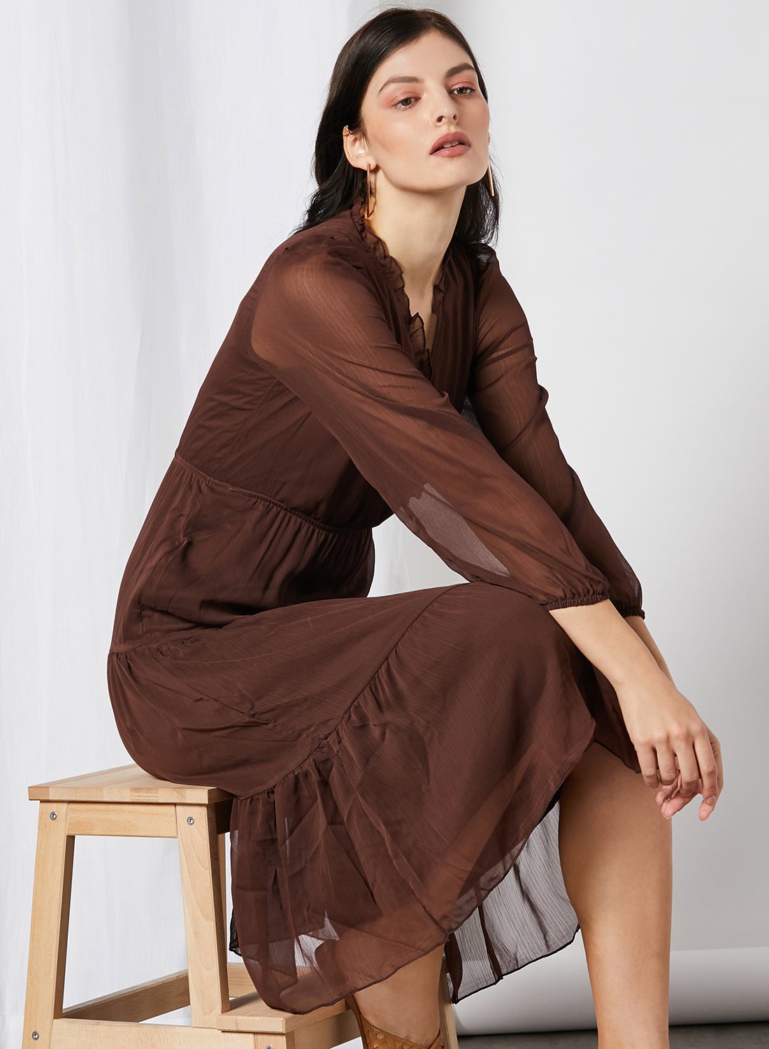 | nameOriginal | Ruffled Neckline Sheer Sleeve Dress Brown |