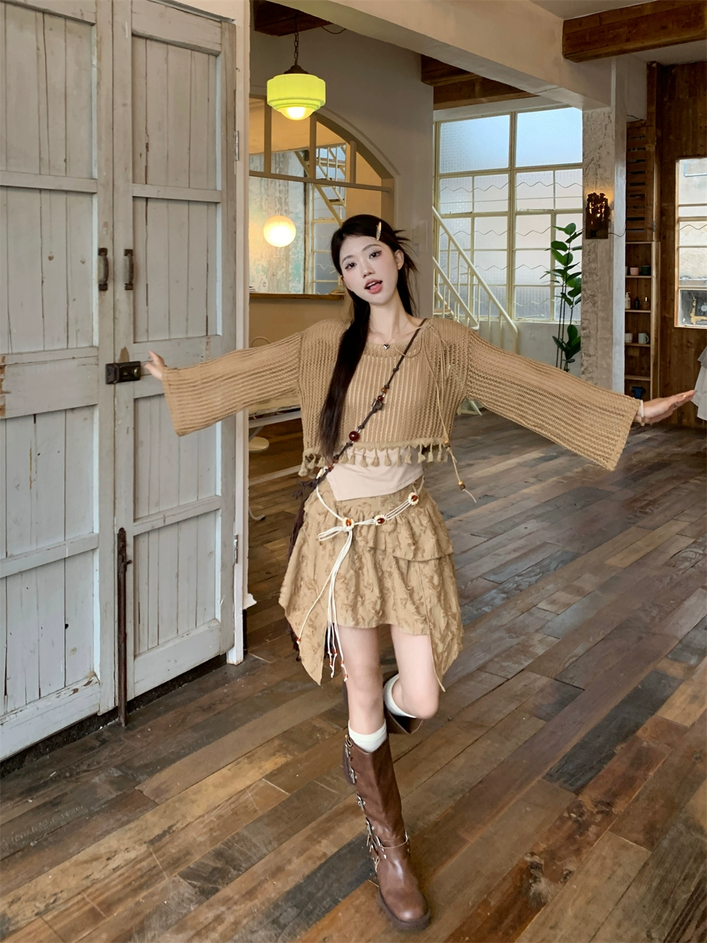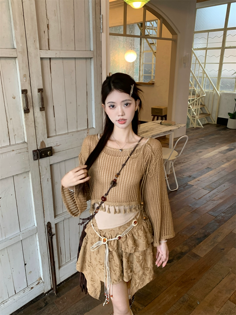| nameOriginal | Brown fringed hollow camisole half-length blouse |