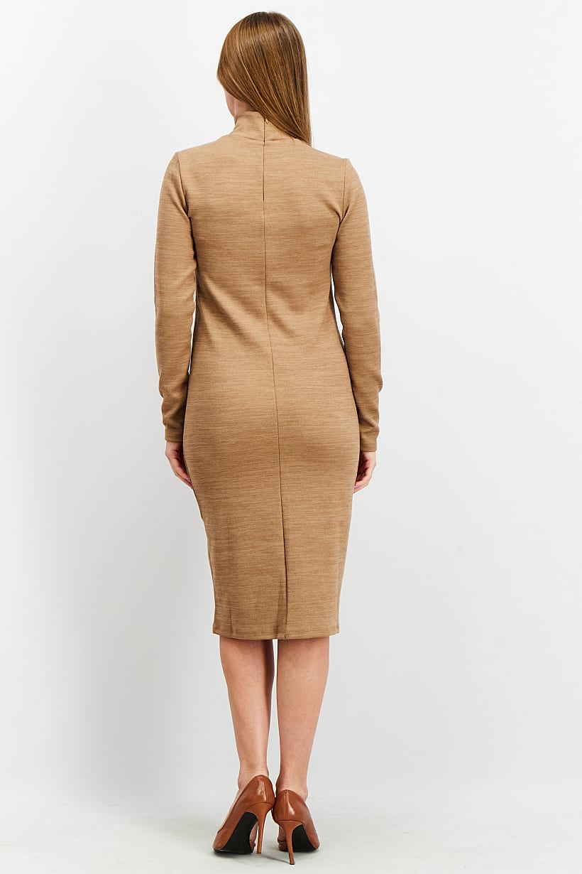 | descriptionOriginal | Care : Machine washable, Dress Style : Midi, Fit : Regular fit, Size shown : International, Types of Hem : Straight hem, Types of Neckline & Collar : High neckline, Types of Sleeve : Longsleeve, Disclaimer : Product color may slightly vary due to photographic lighting sources or your monitor settings., Fabrics : 75% Polyester, 20% Cotton, 5% Elastane, Occasion : Casual, Pattern & Print : Heather, Types of Closures : Zipper closure, Color Family : Brown, |