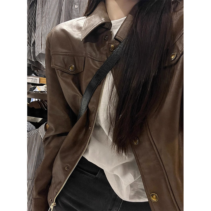 | nameOriginal | Brown leather coat for women Spring and Autumn 2024 new small retro pu motorcycle leather jacket loose top |