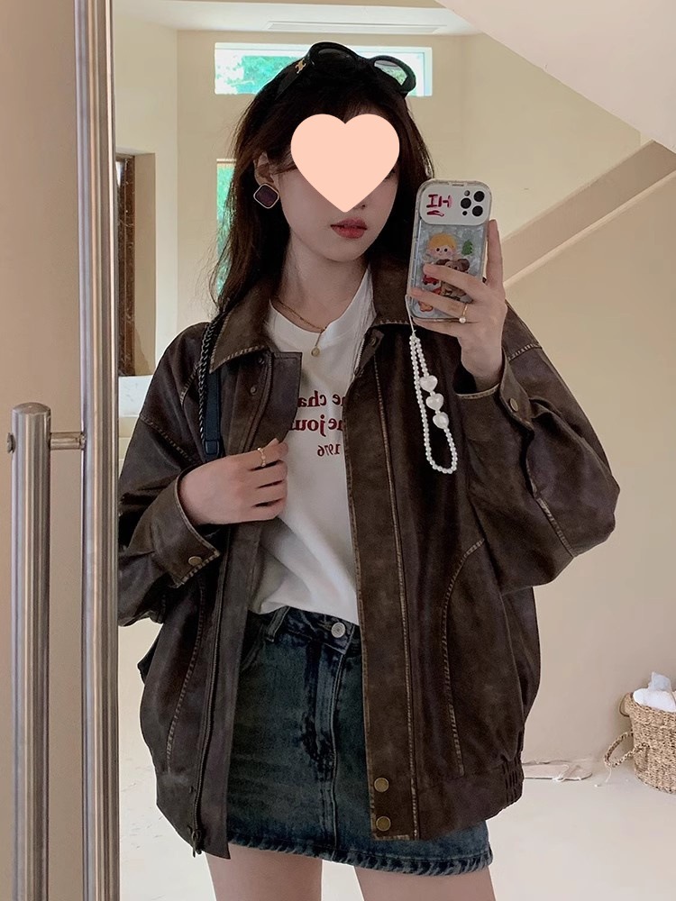 | nameOriginal | brown Leather Jacket Women's Spring 2024 New Hong Kong Style Retro Biker Clothing Internet Celebrity Fried Street Jacket Maillard Wear |