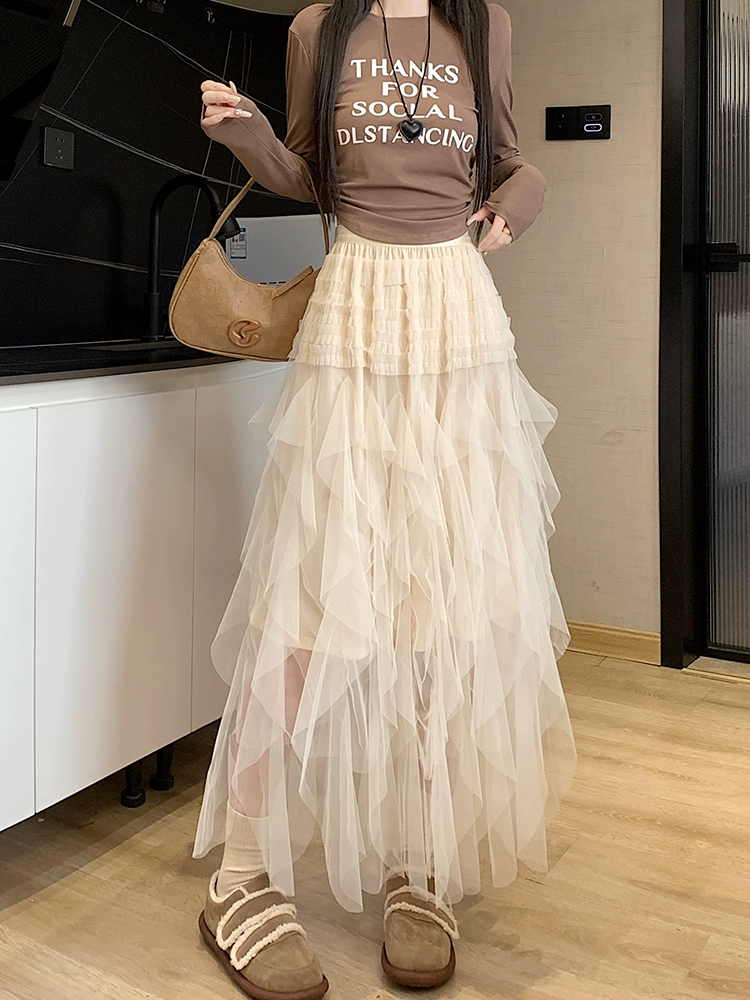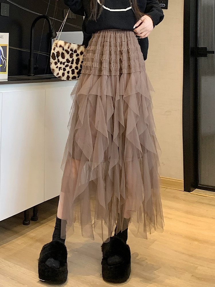 | nameOriginal | Brown mesh spring and summer irregular mid-length cake skirt |