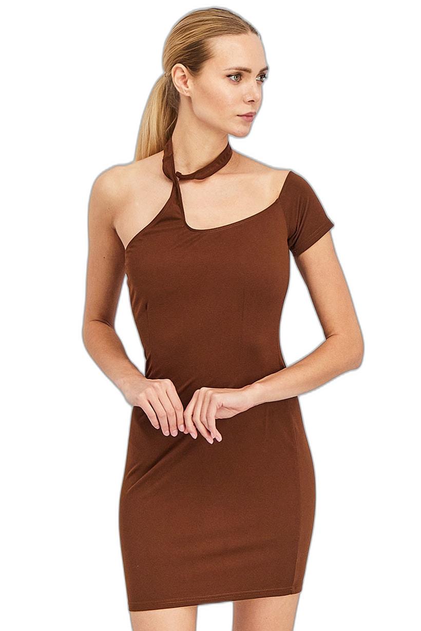 | sub_Categories | Women Clothing, Dresses, women choker neckline one shoulder plain dress brown |
