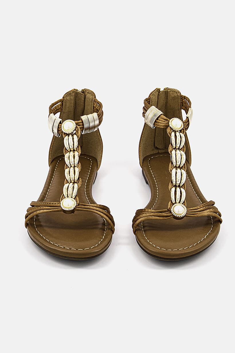 Women Satin With Pearls And Gold Plates Sandals, Brown