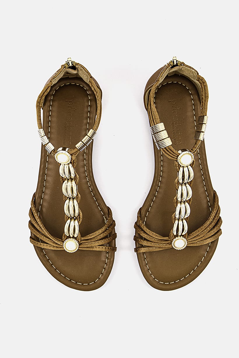 Brown Satin Sandals with Gold Plates and Pearls for Women.