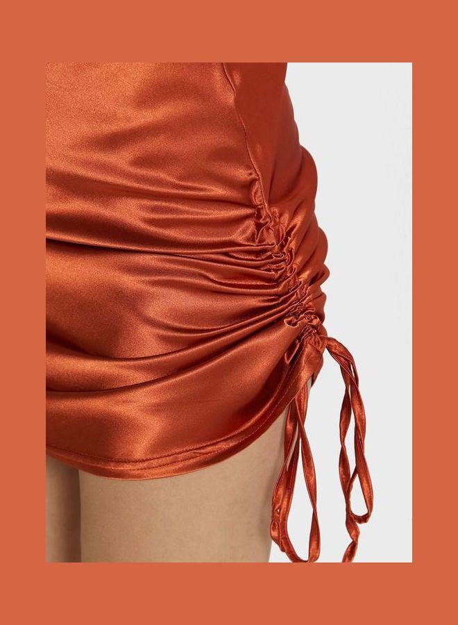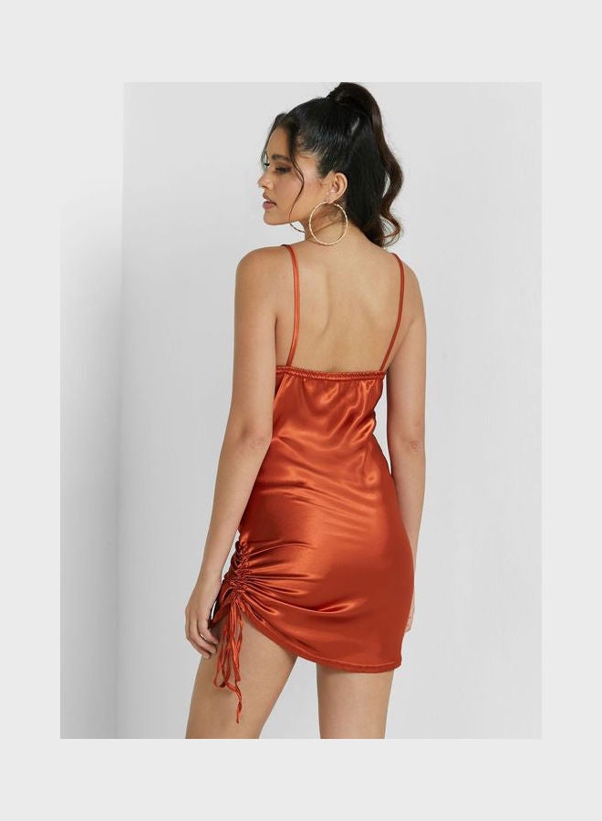This product features a luxurious polyester blend fabric with a smooth and silky satin-like texture. It boasts a stylish cowl neck and delicate shoulder straps. The side is gathered and can be adjusted with drawstrings to create a flattering ruched effect. The dress has a mini length and a body-hugging fit that accentuates your curves.