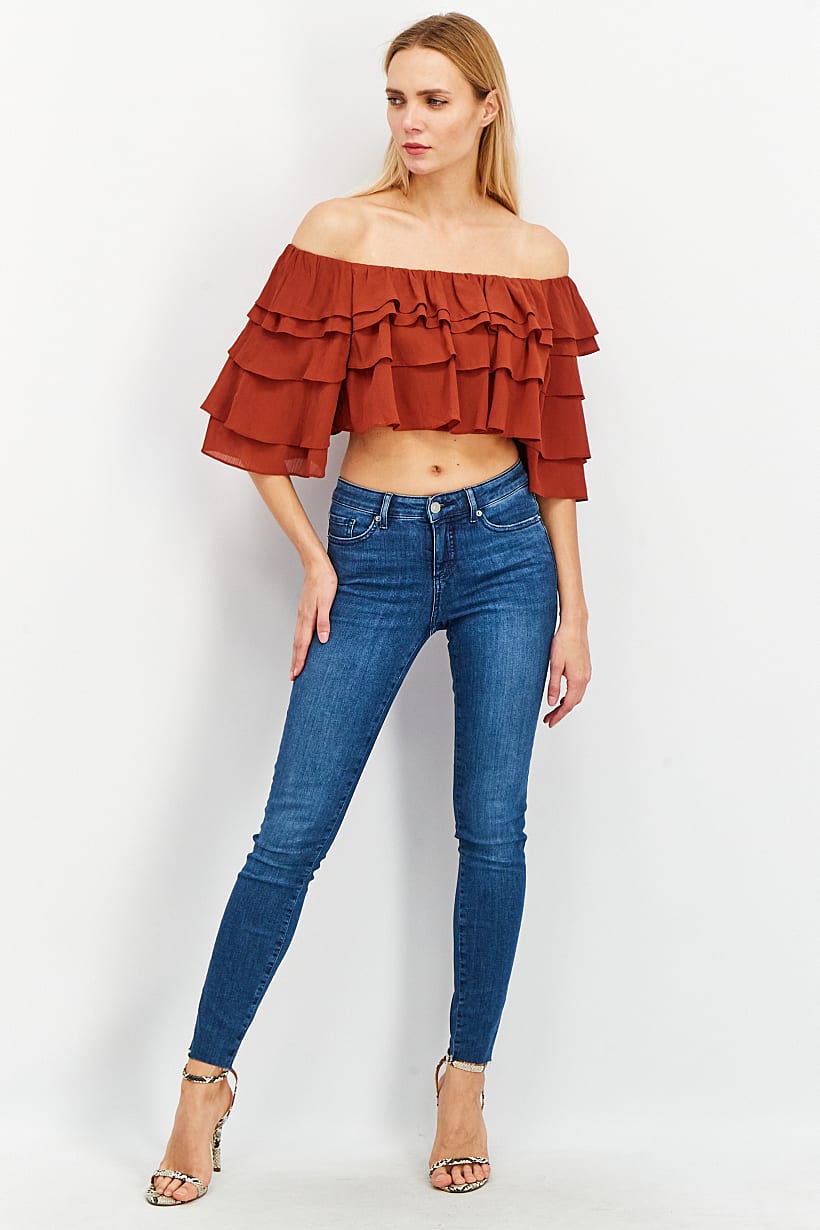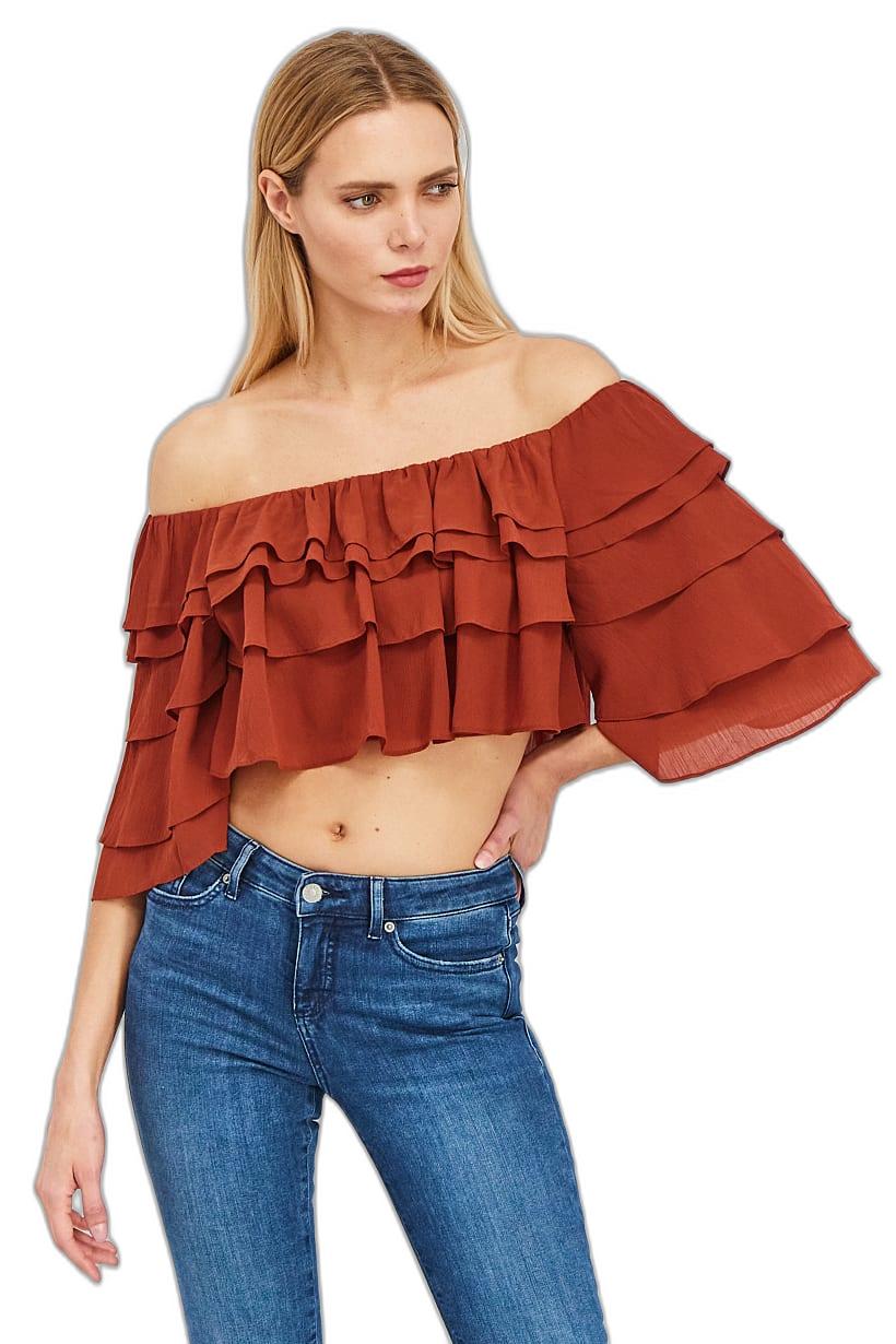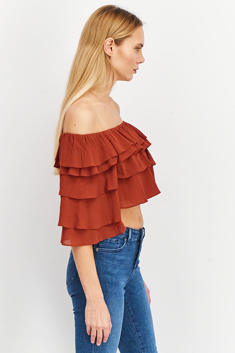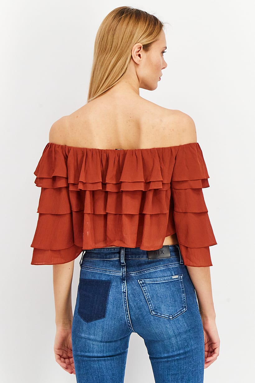 | sub_Categories | Women Clothing, Tops & Tees, women off shoulder neck ruffle sleeve textured crop top brown |