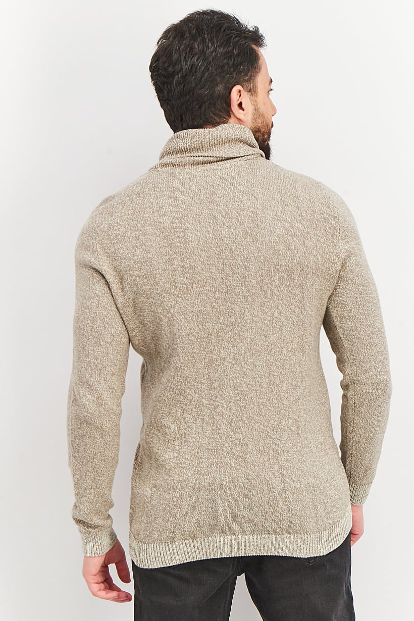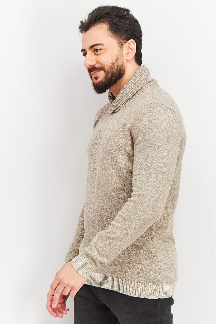 Men Ribbed Collar Textured Long Sleeve Sweater, Brown