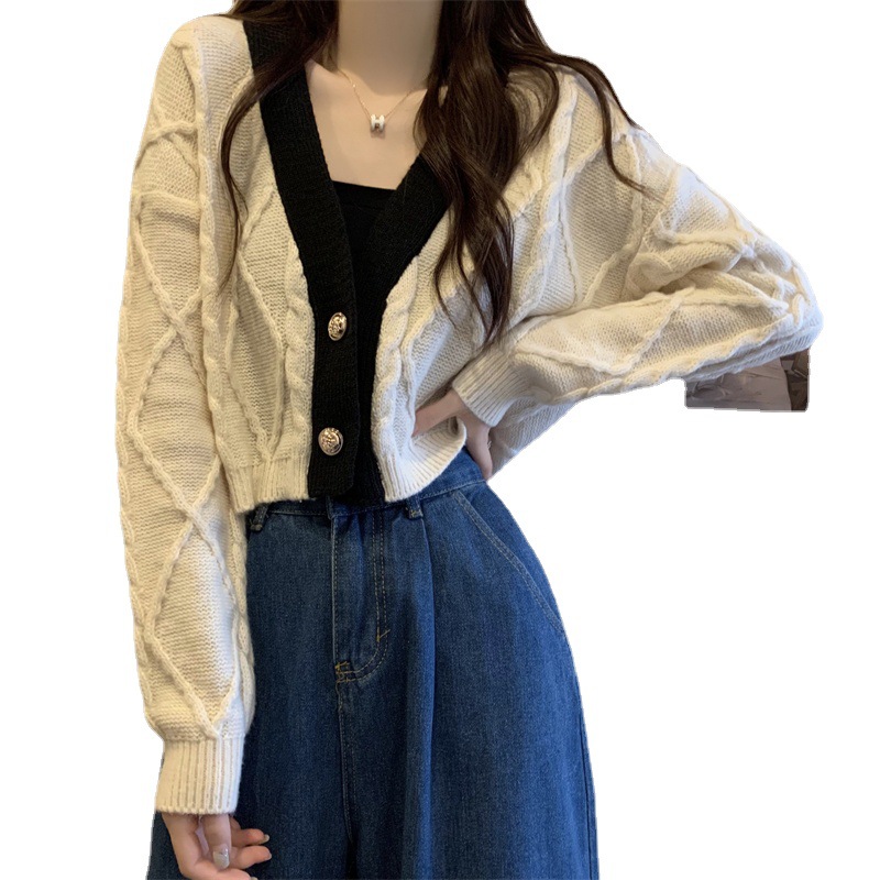 Brown V-neck knitted cardigan women's autumn and winter short high waist long sleeve big Lang sweater coat Maillard shoulder top
