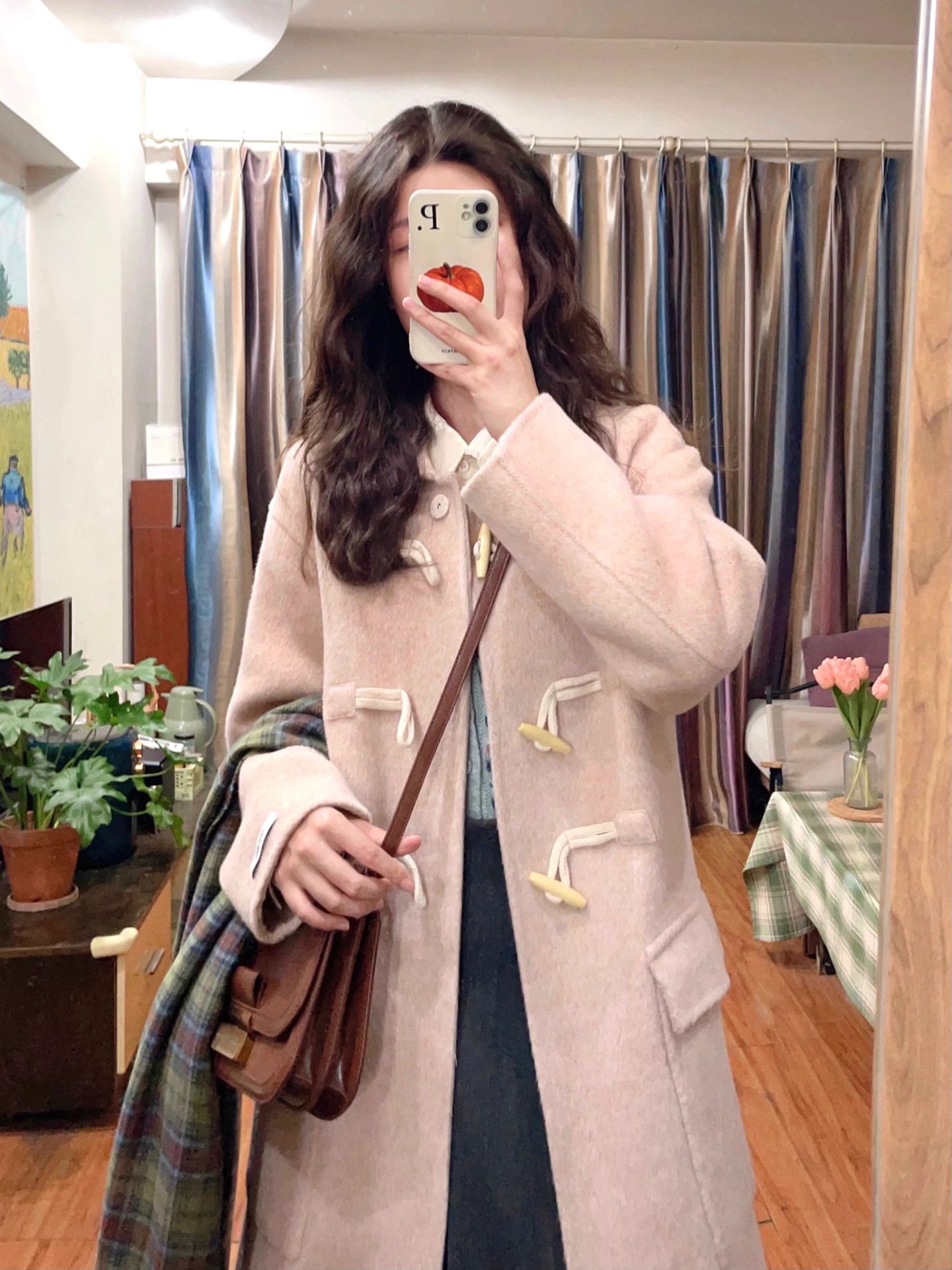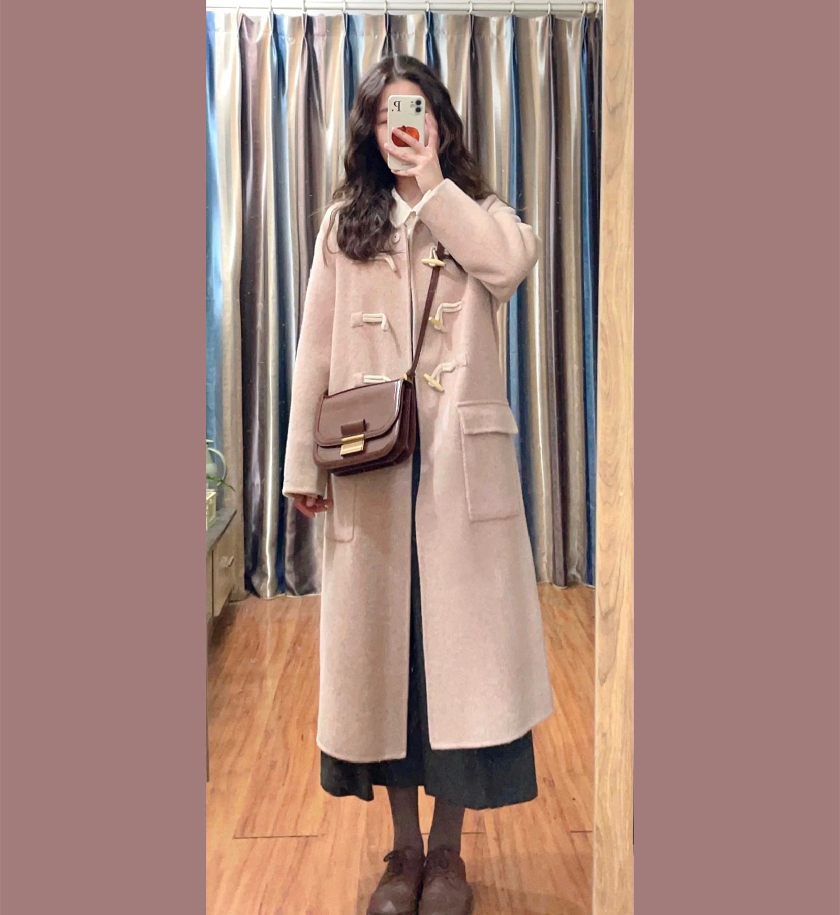 Buckle coat for women autumn and winter 2023 new high-grade Korean gentle mid-length small pink woolen coat